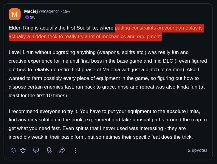 Another example: a couple of weeks ago, I wrote about the life lessons that Elden Ring, a particularly difficult video game, taught me. One comment was talking about the air-restriction-training analogue for Elden Ring: “putting constraints on your gameplay is actually a hidden trick to really try a lot of mechanics and equipment.”