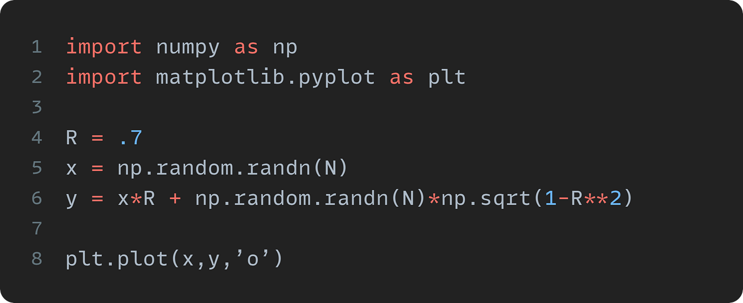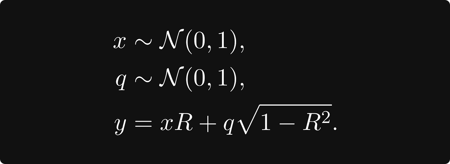 In other words, x and q are random numbers sampled from a normal (Gaussian) distribution, and x and y are variables correlated at approximately r = R. Why is the actual correlation only approximate? That’s because R is the population correlation, while r is the sample correlation. With larger sample sizes, the sample correlation will more closely match the population correlation.