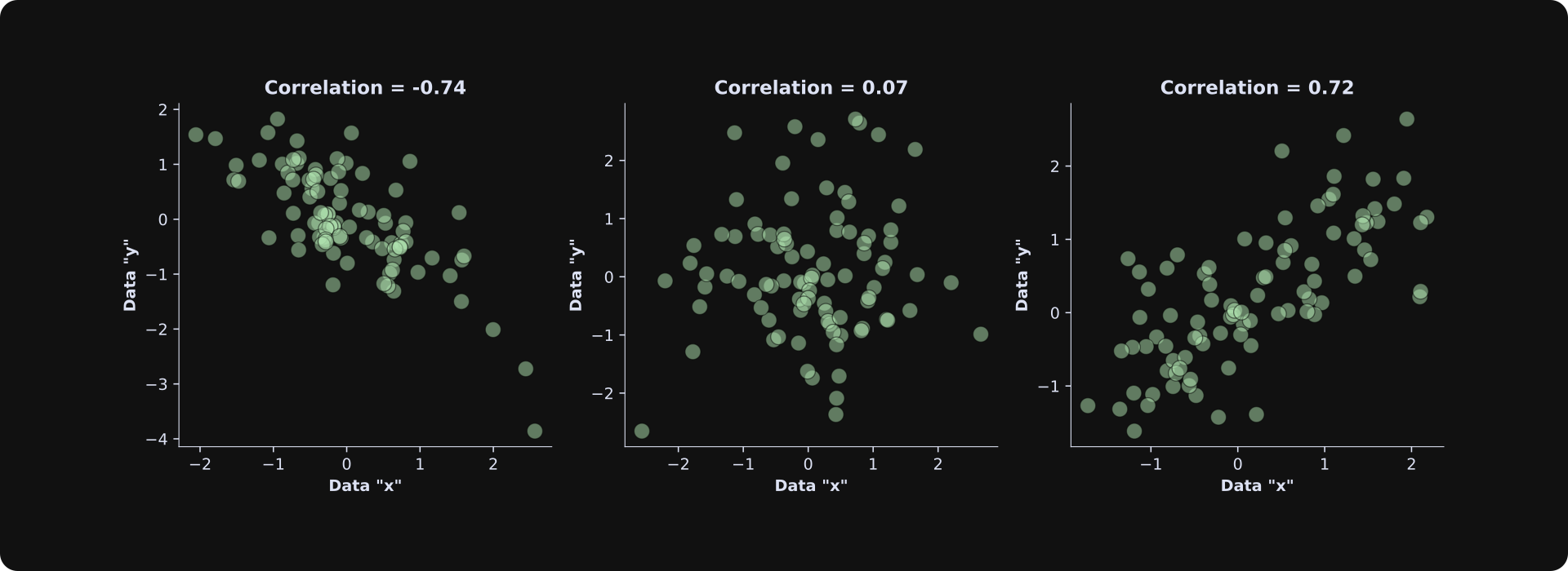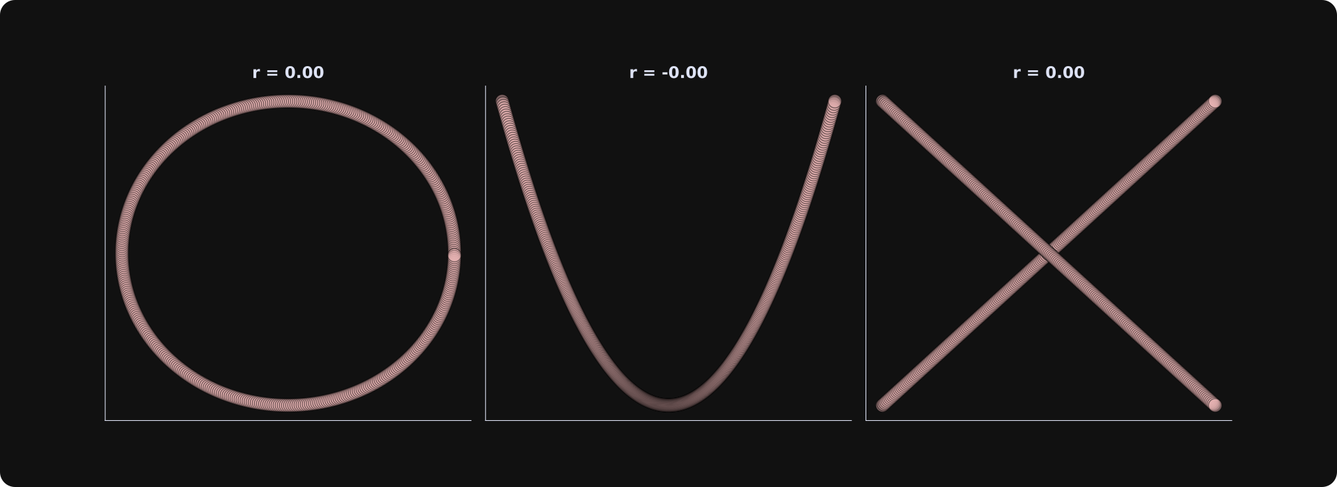 For some intuition, here’s a picture of three datasets with three correlation coefficients: