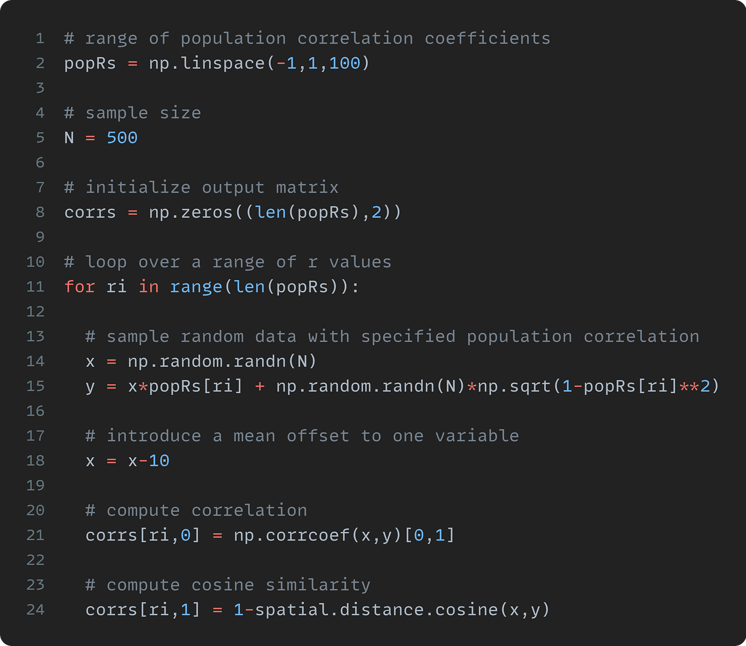 The goal here is to simulate correlated data, with correlation values ranging from -1 to +1. The data are created using the equation I showed earlier, but I added an offset of -10 to variable x. Of course, that doesn’t matter for the correlation because the mean is subtracted off. But that offset does get incorporated into cosine similarity.