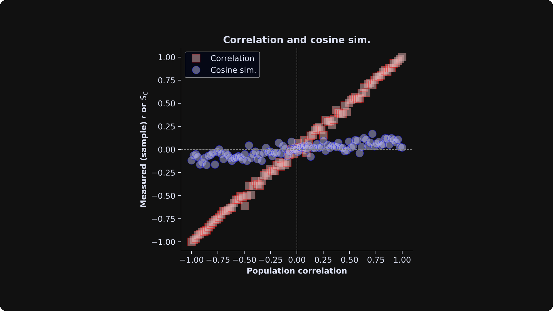Stunning differences! The x-axis is the population correlation value (R) and the y-axis is the sample correlation (r) or cosine similarity. The correlation coefficient nearly perfectly tracks the population correlation, with minor deviations attributable to noise and limited sample sizes. The cosine similarity, on the other hand, remains quite small, regardless of the actual correlation coefficient. That discrepancy is entirely due to the mean offset in variable x.