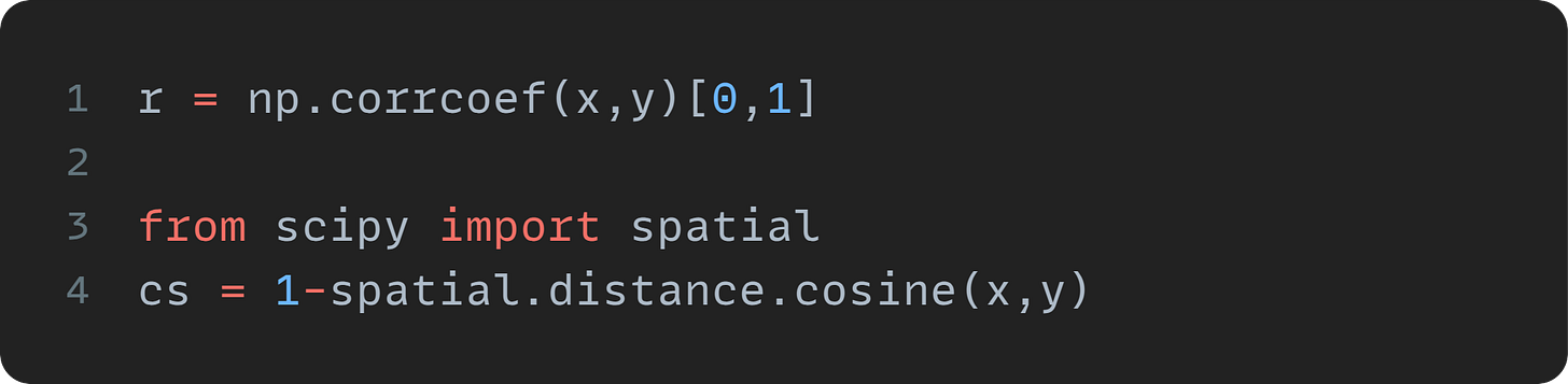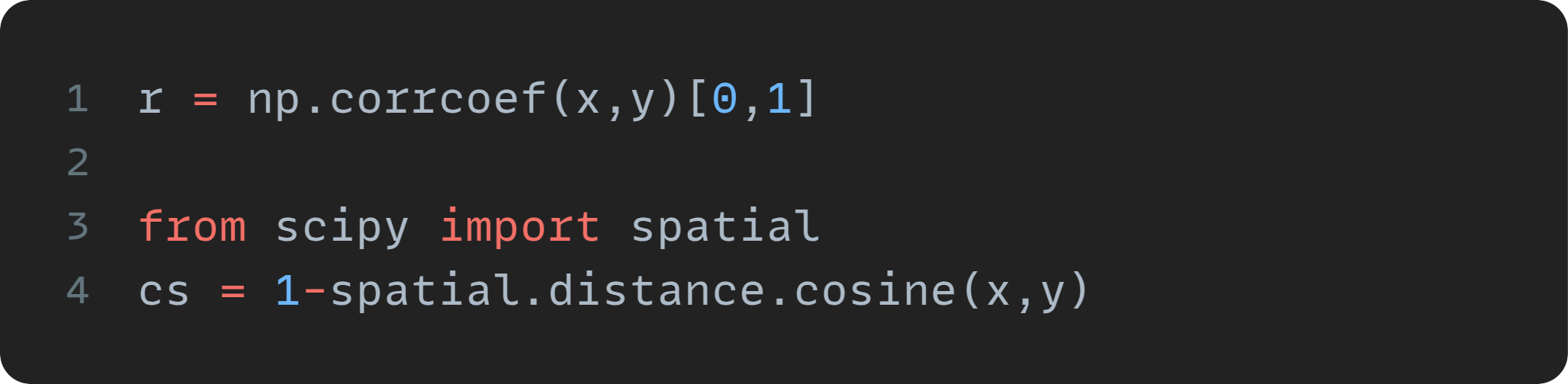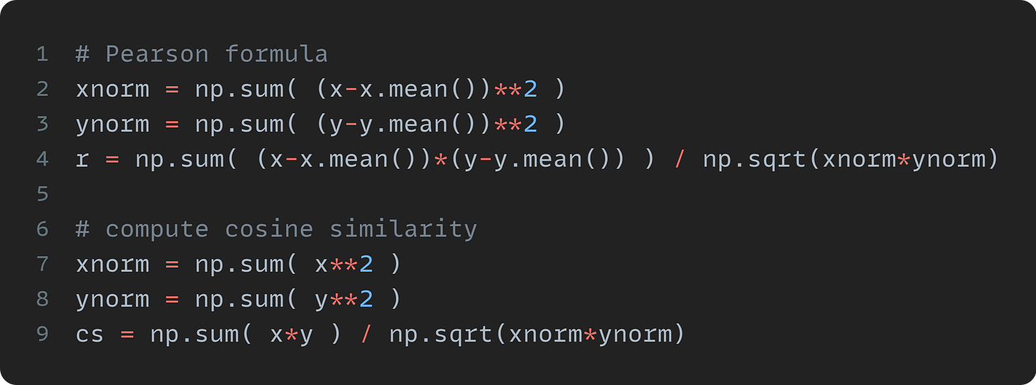 The code block below shows how to calculate correlation and cosine similarity using a direct translation of the formulas shown earlier.