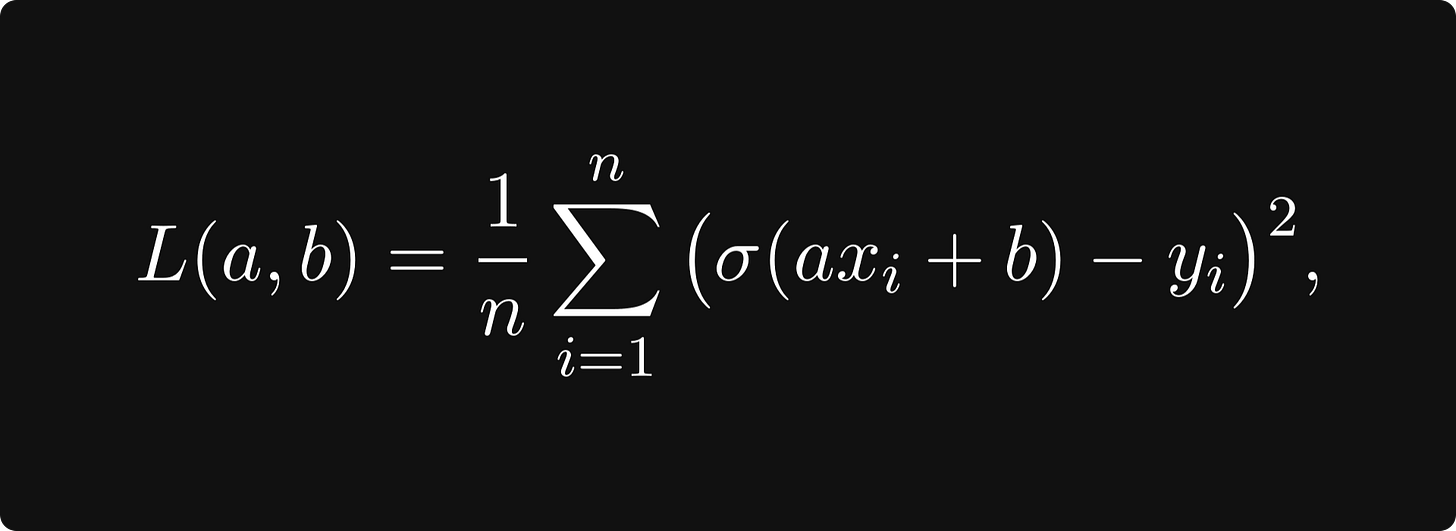 To train a model, we combine it with a loss function — like the mean-squared error — and minimize the loss: if x₁, x₂, …, xₙ are our training data samples with labels y₁, y₂, …, yₙ, then the mean-squared error is given by the bivariate function