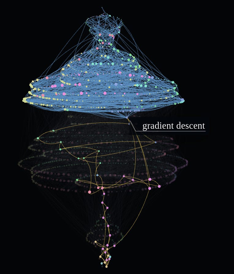 With this, you can visualize subfields, the roots of machine learning (surprise: mathematics), the central concepts, and a bunch of other cool stuff, like tracing the prerequisites (yellow edges) and dependents (blue edges) of gradient descent.