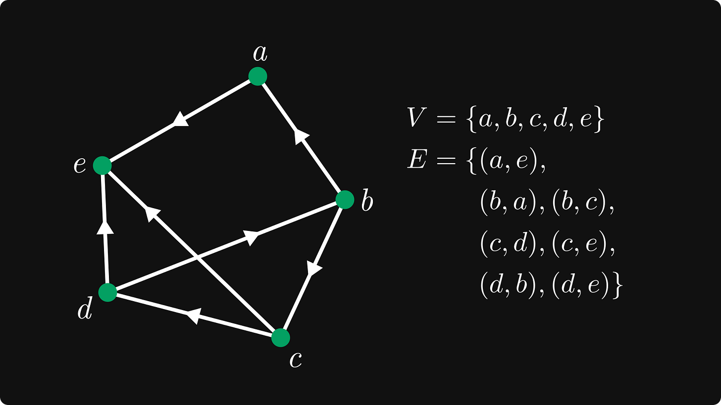 Mathematically, we are still speaking about the same (V, E) structure, but this time, the edges are ordered tuples (u, v) ∈ E instead of sets. Thus, (u, v) ∈ E means an edge that starts from u and goes to v.
