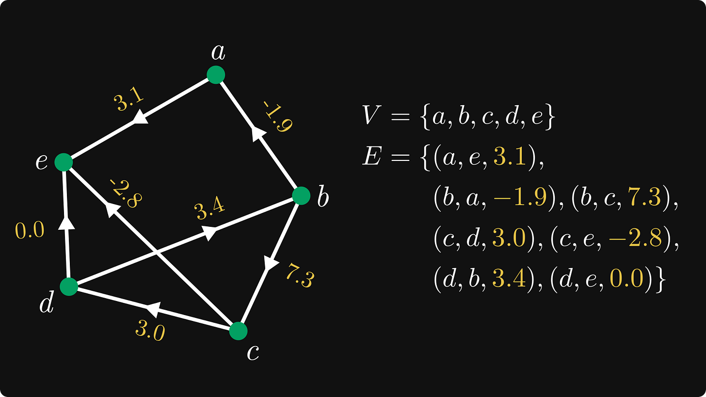 Definition 3. (Weighted and directed graphs.) The tuple (V, E) is called a weighted and directed graph if V is a finite set, and E ⊆ V × V × ℝ is a set of ordered triplets.