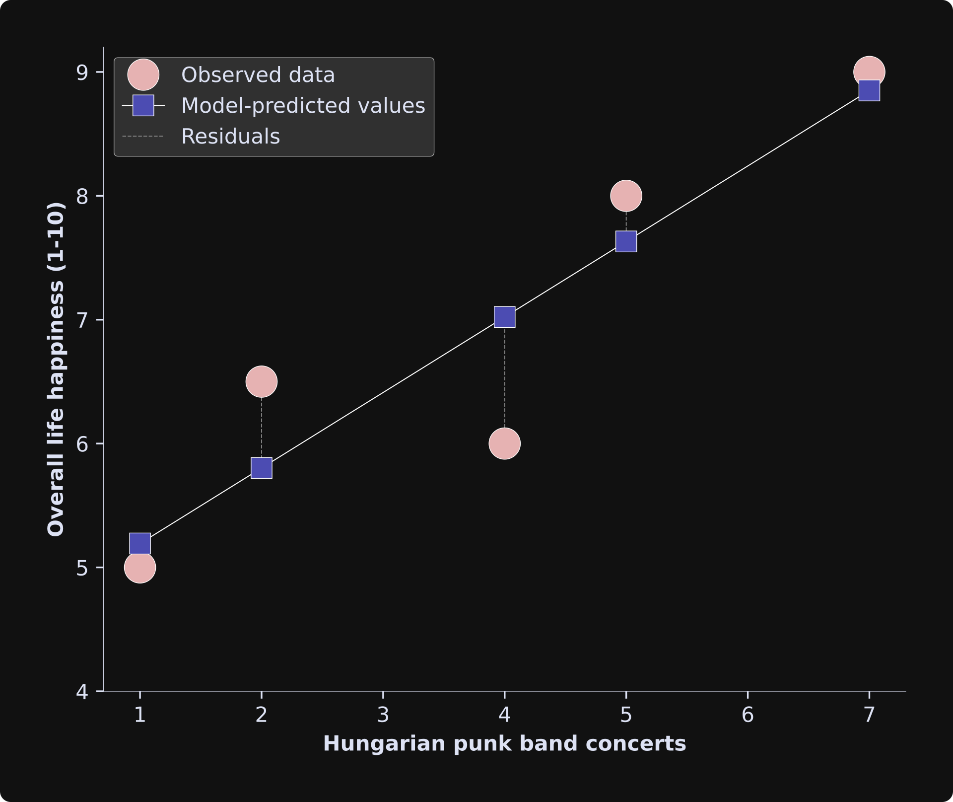 (Note about causality: The terminology is that life happiness “depends on” punk shows, which is a variable that we can “independently” manipulate or observe. That phrasing implies a causal relationship. However, statistical models alone cannot prove causality. It’s also possible that happier people just find Hungarian punk more sonorous. Causal relationships can only be established with well-controlled experiments.)