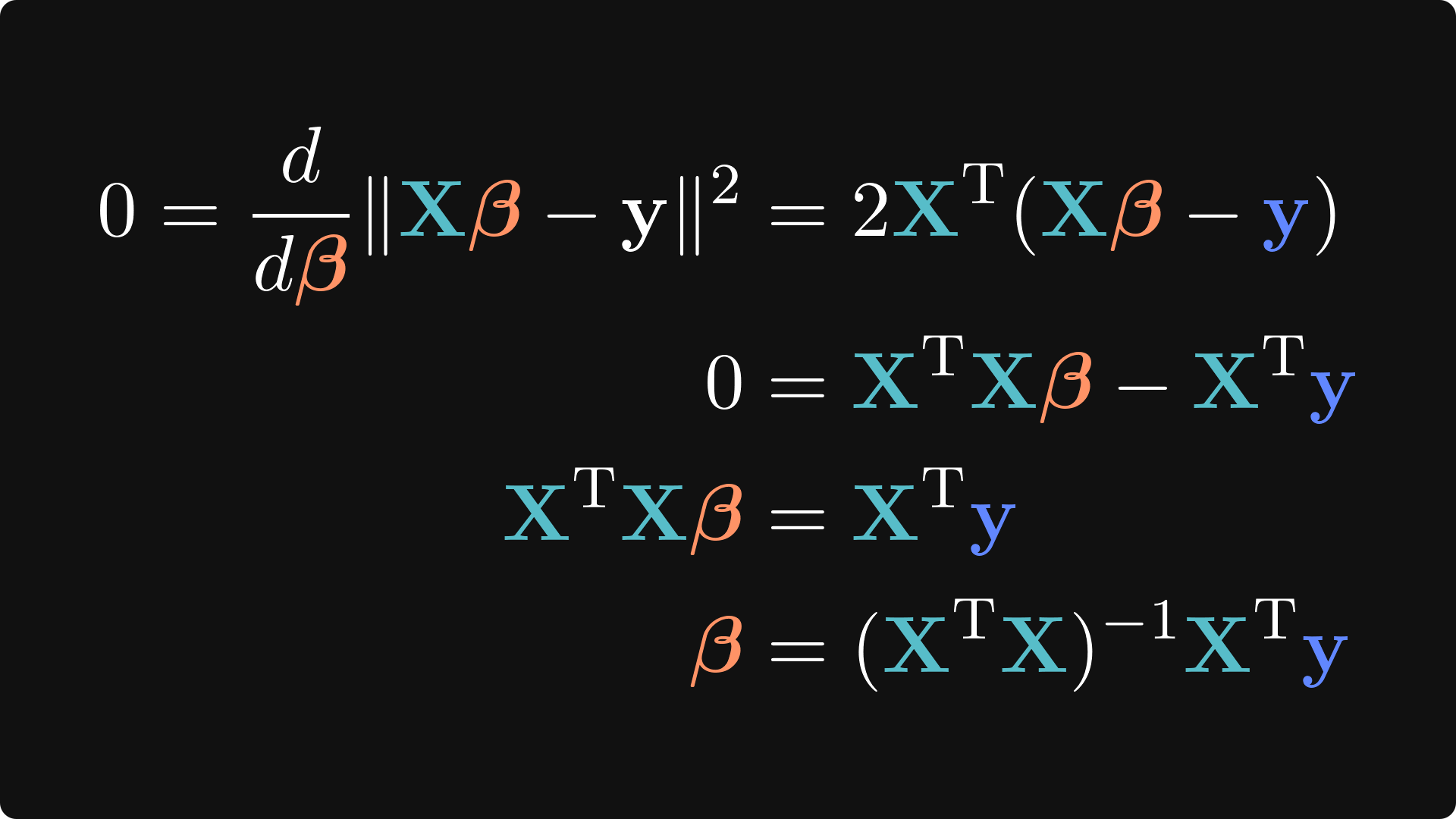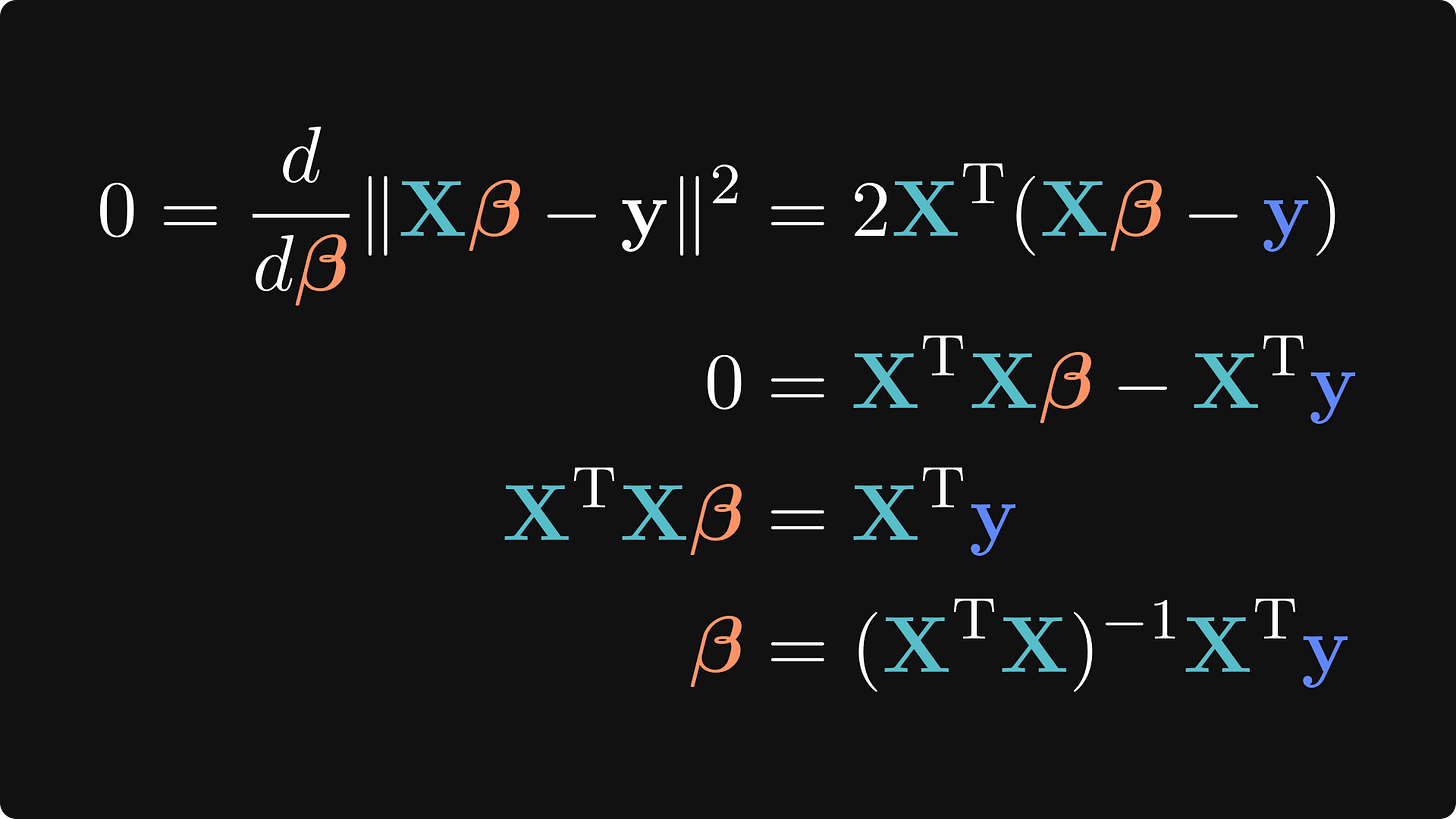 If you’ve taken a calculus course, you will recognize the form and the solution to this optimization problem: set the derivative to zero and solve for 𝜷.
