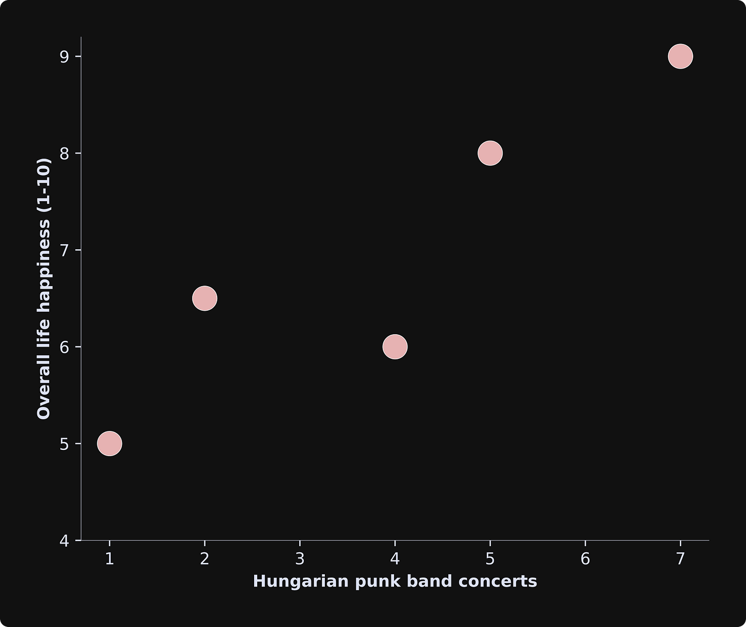 Let’s imagine we take a scientific research trip to Budapest and ask five randomly selected people two questions: (1) What is your overall life happiness (from 1-10) and (2) How many Hungarian punk band concerts have you been to in the past year?