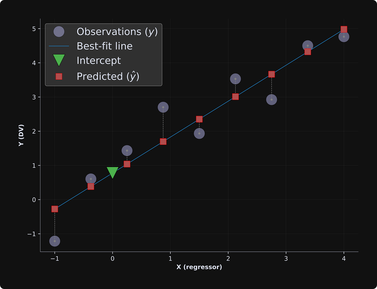 Intercept (green triangle). This is the predicted observation when all predictors are set to zero. You can think of it like a “baseline” value that the model predicts, even if we have no actual baseline data.