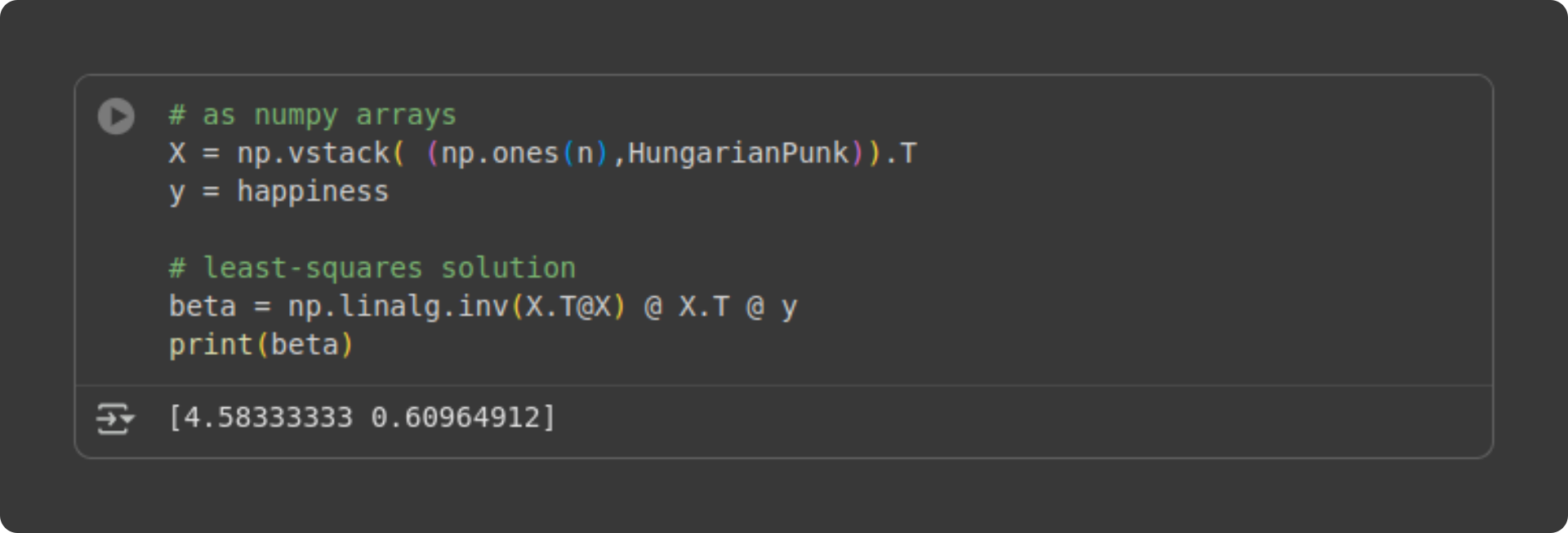 Let’s write down some equations. The equations below are mathematical descriptions of the data shown in the figure above. The DV is blue, the IV is yellow, and the intercept is green. The beta values (𝛽) are the unknown parameters that describe the relationship between punk shows and life happiness (the punk-regressor term is orange). The goal of least-squares is to find those values.