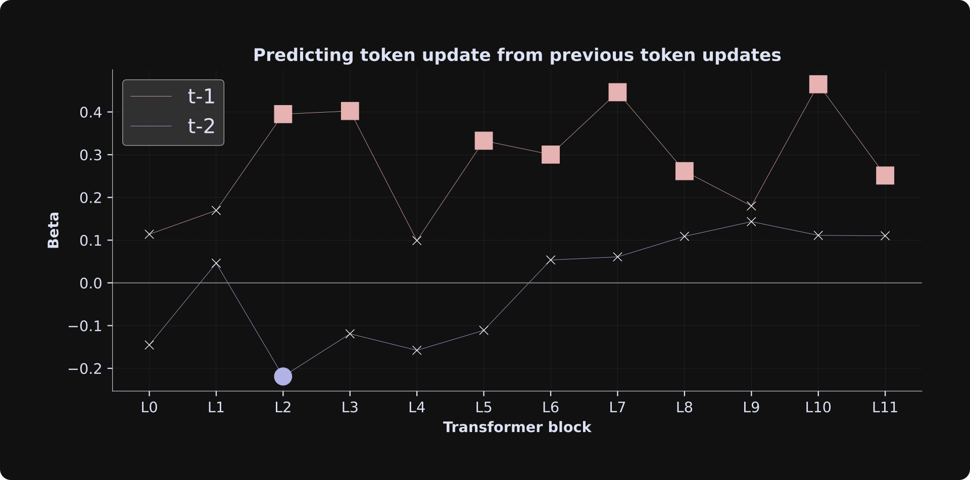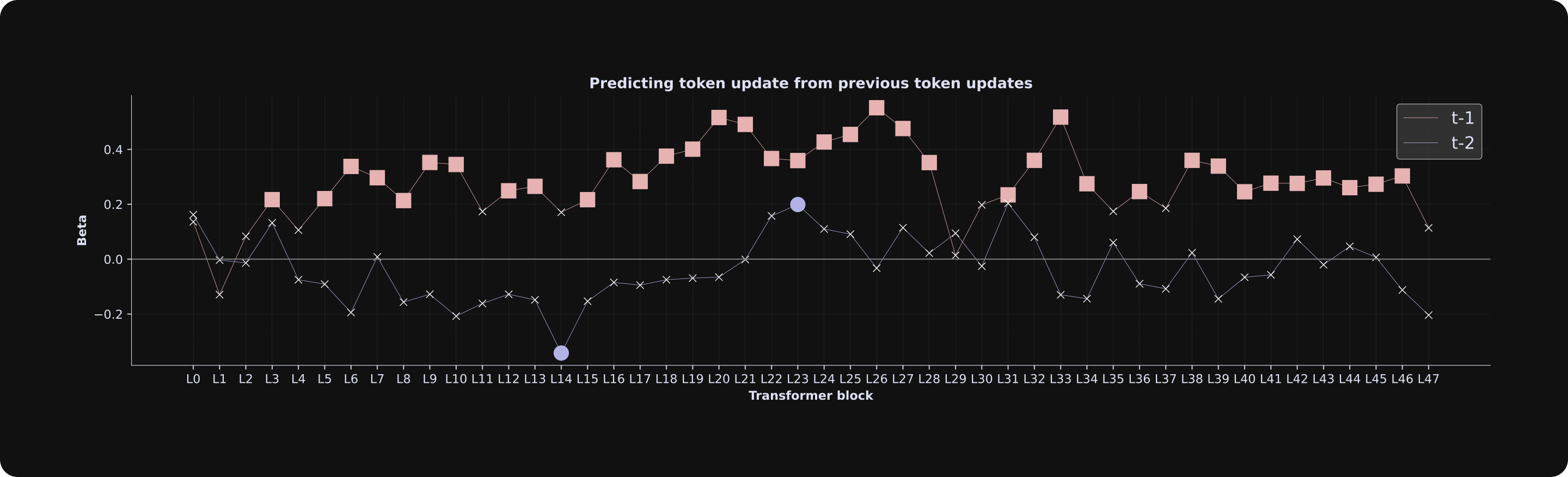 The results indicate that the previous token’s adjustment predicts the current token’s update magnitude, but not the adjustment from two tokens previously. Numerically, the t-2 adjustment negatively predicts the current token update (that is, when the t-2 token adjustment was larger, the current token update was smaller) in earlier layers, although most of the betas are non-significant, so you should interpret that result cautiously.