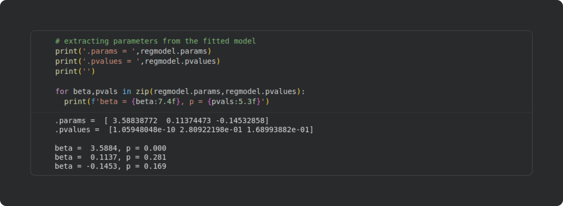 Extract the beta values and corresponding p-values from the model, indexing [1:] because the first parameter is the intercept. You can extend the code by extracting additional model statistics, for example the adjusted R2. So many possibilities for additional explorations 🙂