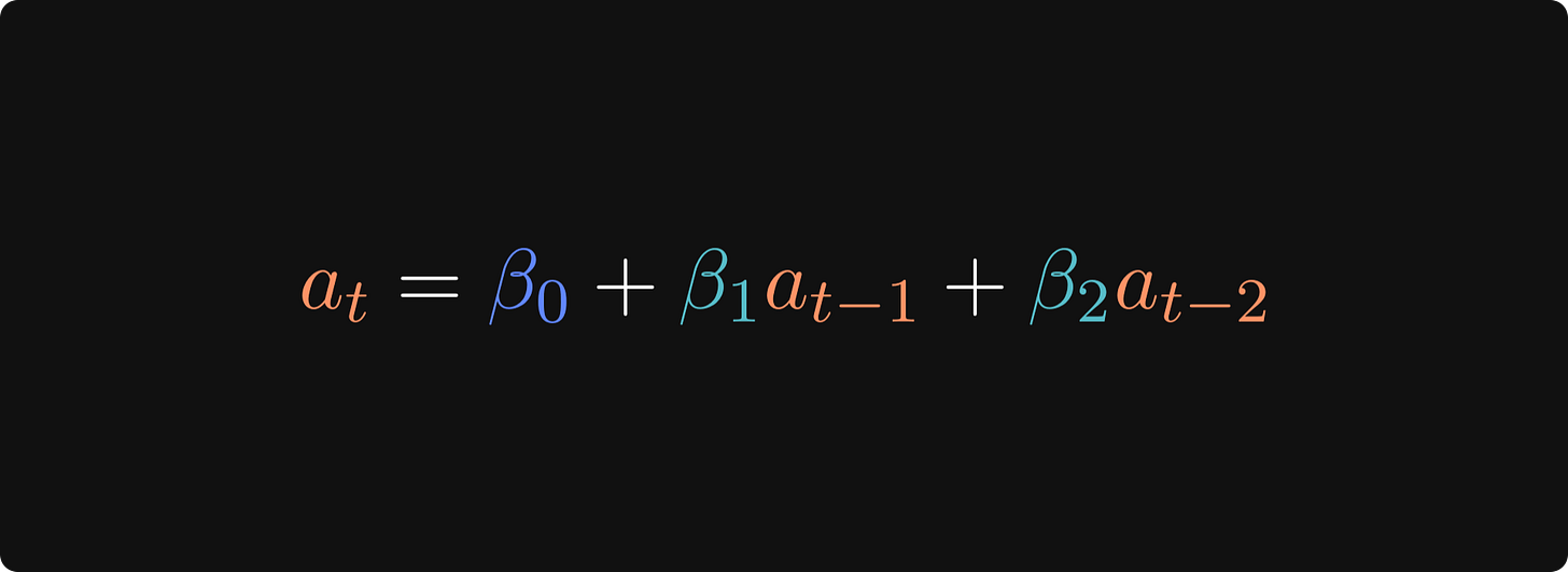 Where at is the magnitude of the attention adjustment on token t, 𝛽0 is the intercept, and 𝛽1 and 𝛽1 are the impacts of the adjustments on the previous tokens.