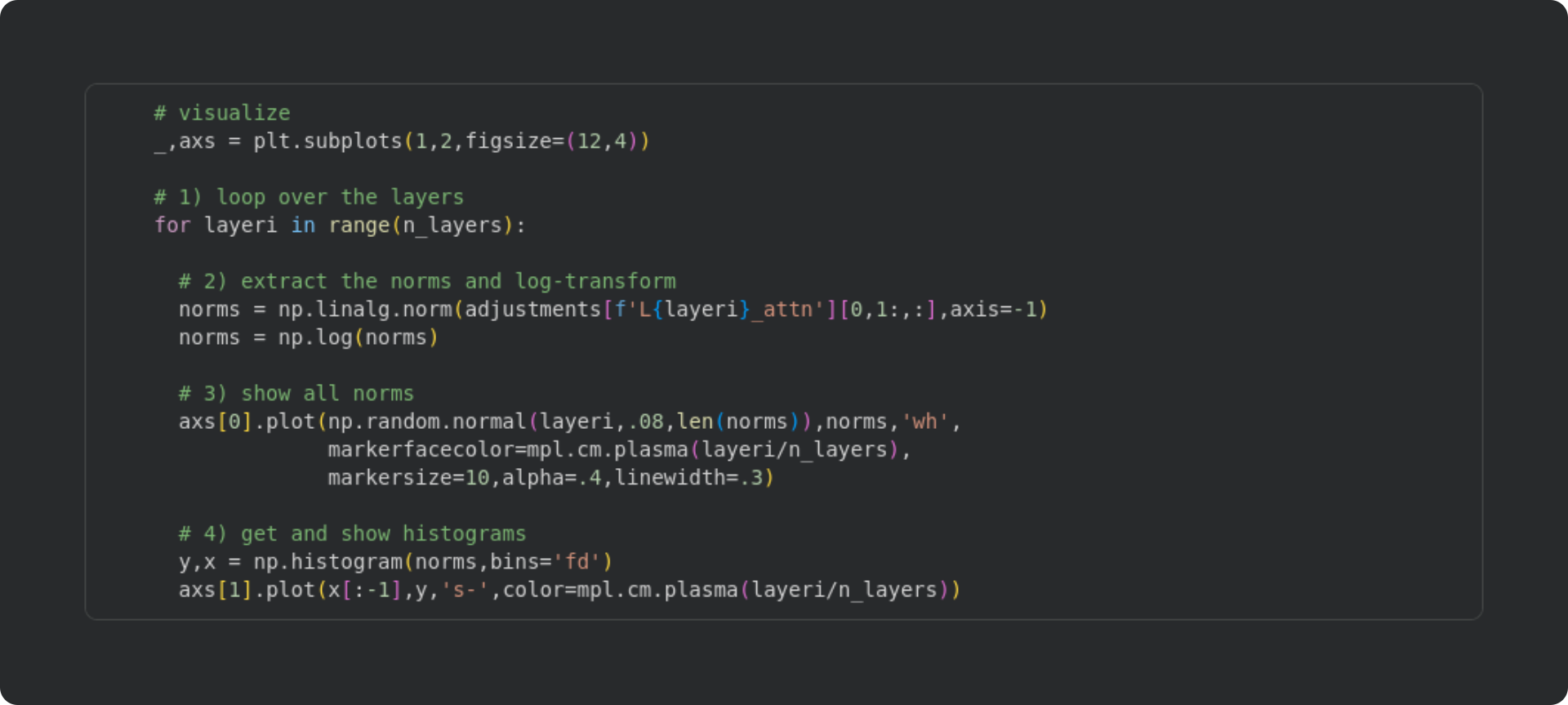 Extract the norms of the attention adjustments and log-transform. It’s the same code as in the previous section, but the layer number for the key name in the dictionary is soft-coded.