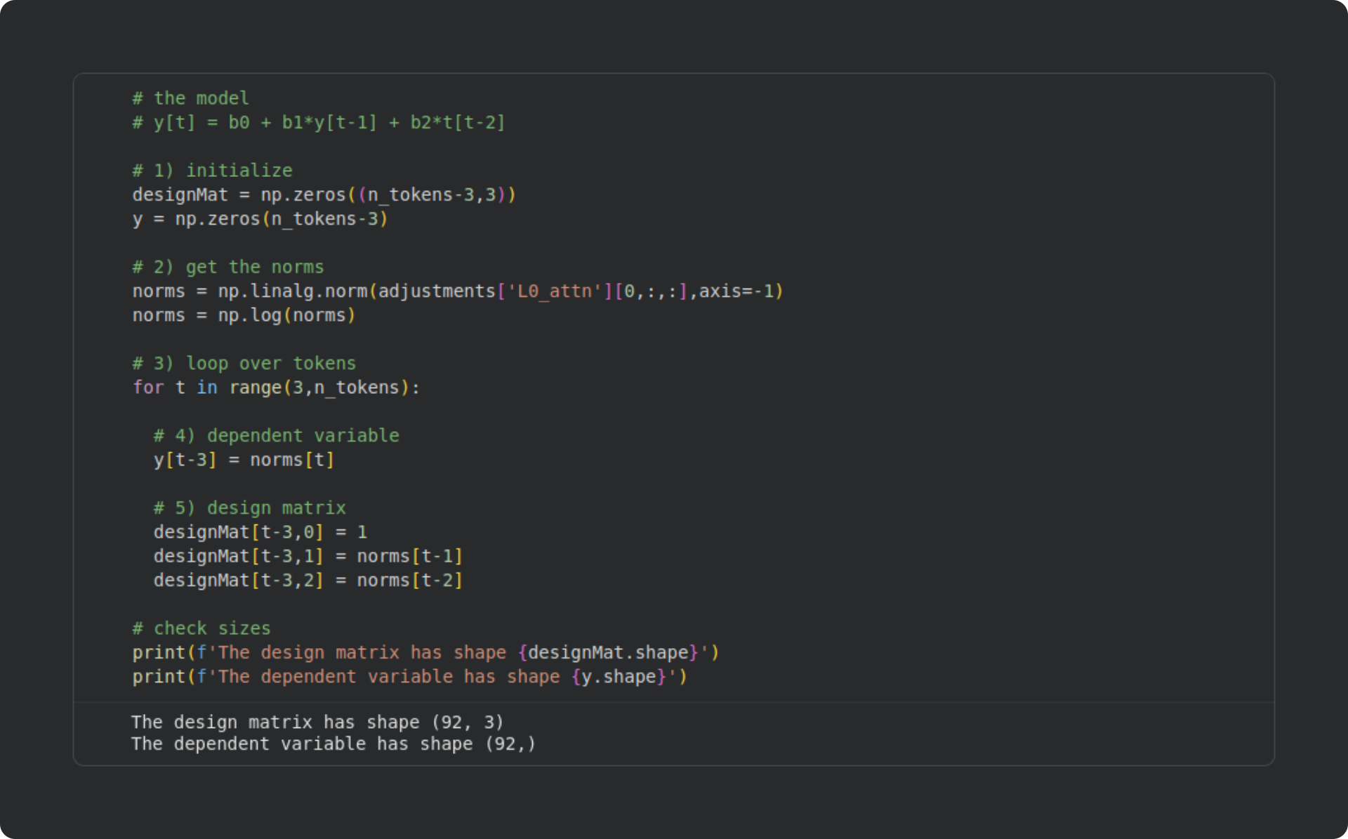 y) to be the current-token norm, and I define the corresponding row in the design matrix to be an intercept term (“1”) and the norms from the previous two tokens.