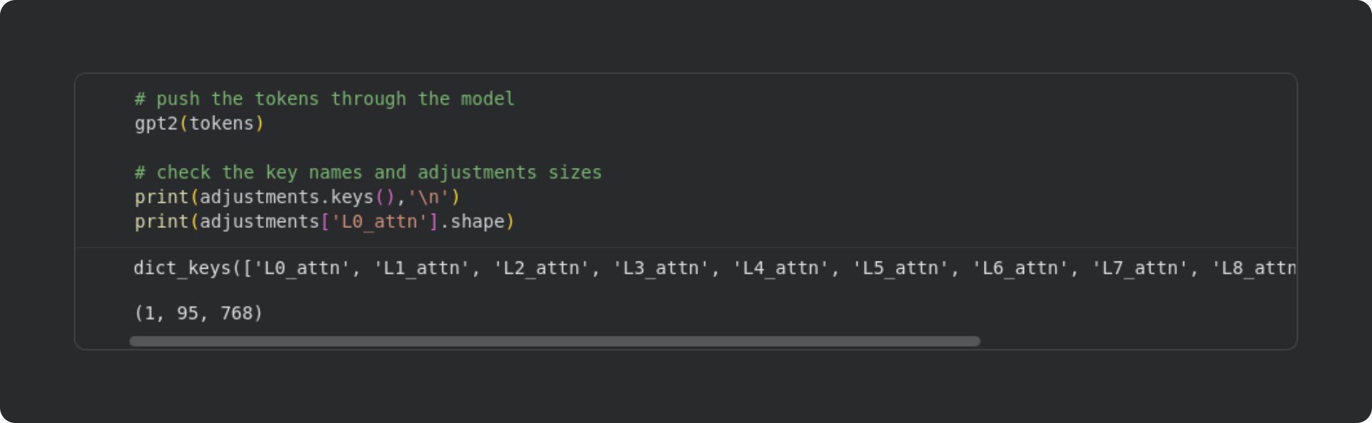 There are several outputs that you can get from the model (e.g., out=gpt2()). However, for this demo, we don’t want the model outputs; we want the model internals. Those were copied into the adjustments dictionary, and you can see the list of keys that were created by the hook functions. The final line of code prints the shape of the NumPy array from one of the attention blocks. It is of size 1 × 95 × 768. “1” corresponds to the number of text sequences that we inputted (it is possible to batch multiple sequences to be processed in parallel); “95” is the number of tokens in the sequence, and “768” is the embeddings dimensionality. Embeddings are a dense representation of the tokens, and allow the language model to modify the tokens according to context and world knowledge. The attention algorithm calculates adjustments to those embeddings vectors, and our hook functions copied those adjustments into the dictionary so we can analyze them.