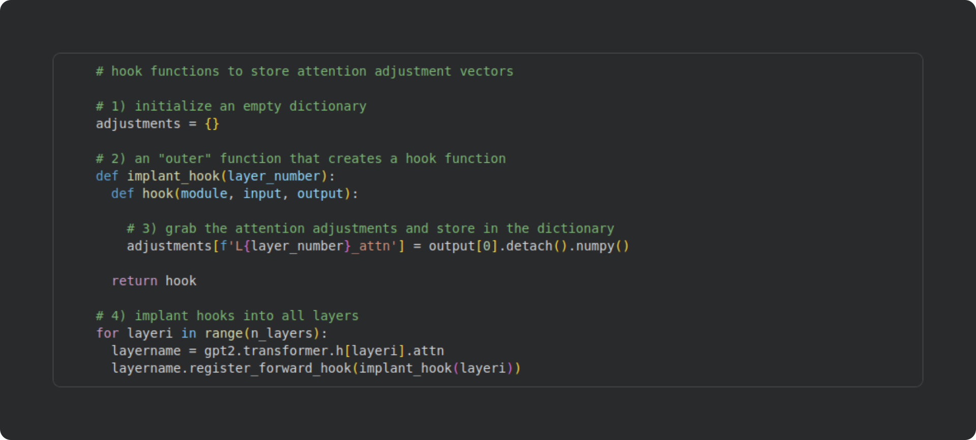To run that analysis, we need to access the internal calculations inside the attention subblock. Those are not readily available from outside the model, but PyTorch models have a special method, called a hook function, that allows us to access the hidden internals of models. A hook function is a regular python function that gets evaluated when a specified layer in the model is run. The code block below shows how I created a hook function that I implanted into each layer (“layer” referring to a transformer block that contains an attention subblock). I will explain each numbered part of the code below.