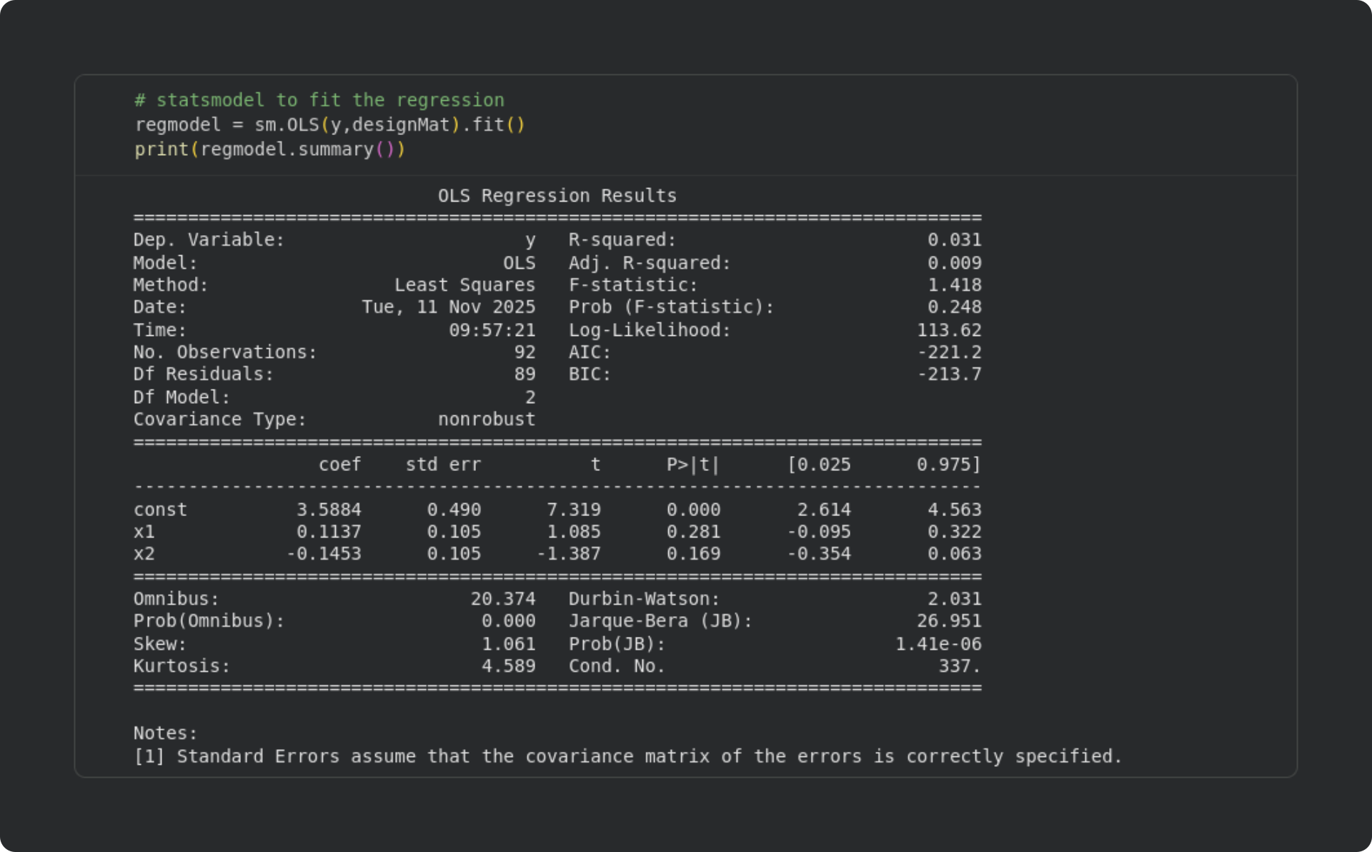 Second is a confirmation that the least squares analysis I taught you in earlier posts gives the same results as sm.OLS. For that, we can repeat the least-squares analysis using NumPy.
