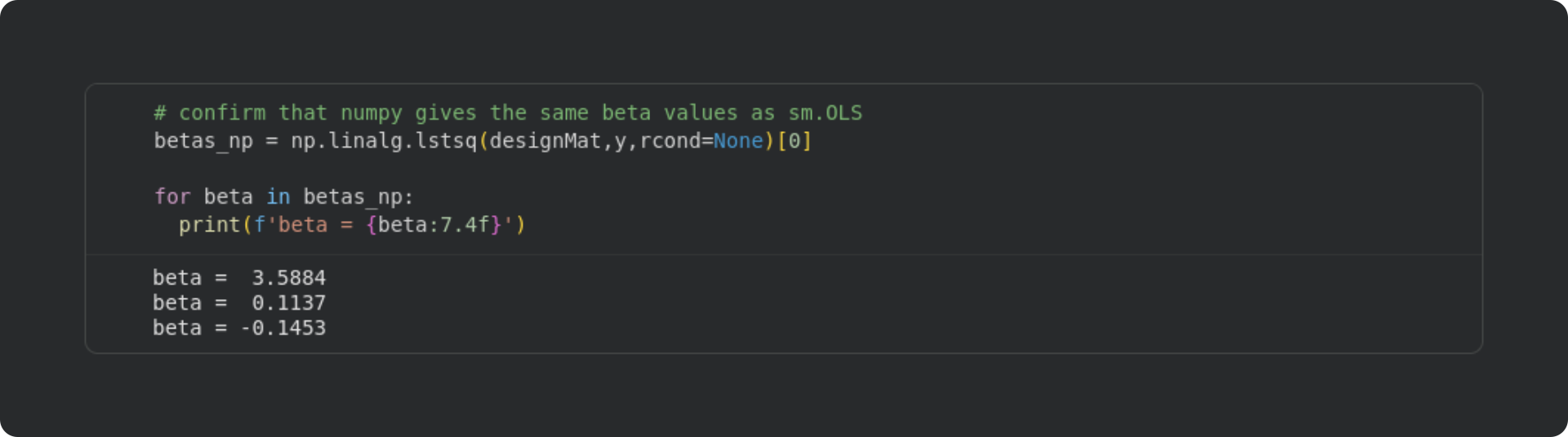 Whether to calculate least-squares directly in NumPy or use the statsmodels library depends on your goals: If you only need the beta values, then it’s easier and simpler to stick with NumPy. But on the other hand, getting the detailed information like p-values to evaluate statistical significance would be much more work with NumPy but is straightforward with statsmodels.