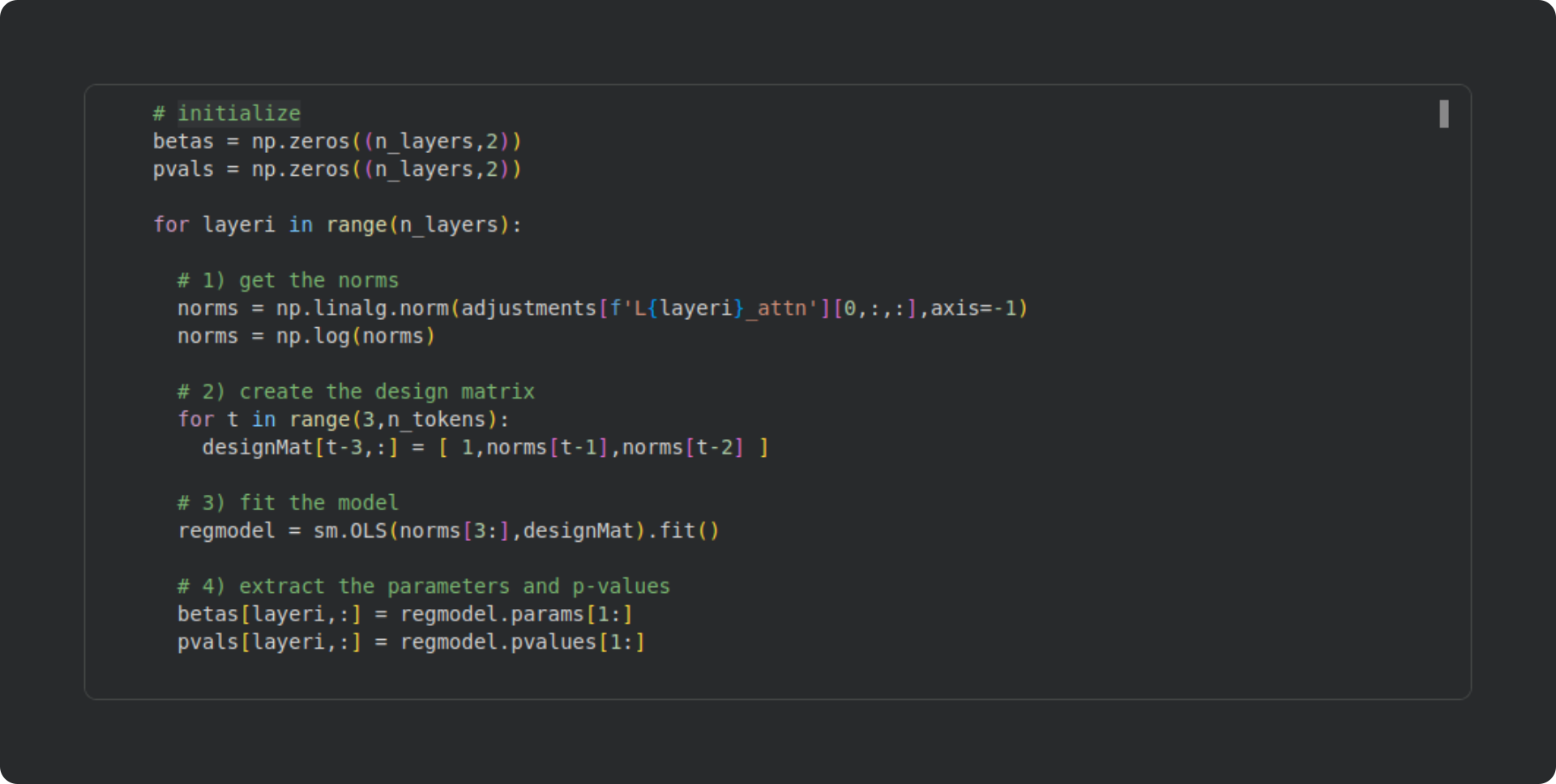 The code block below extracts the attention adjustment norms, creates a design matrix, fits the model, and extracts the beta and p-values. My explanations below.