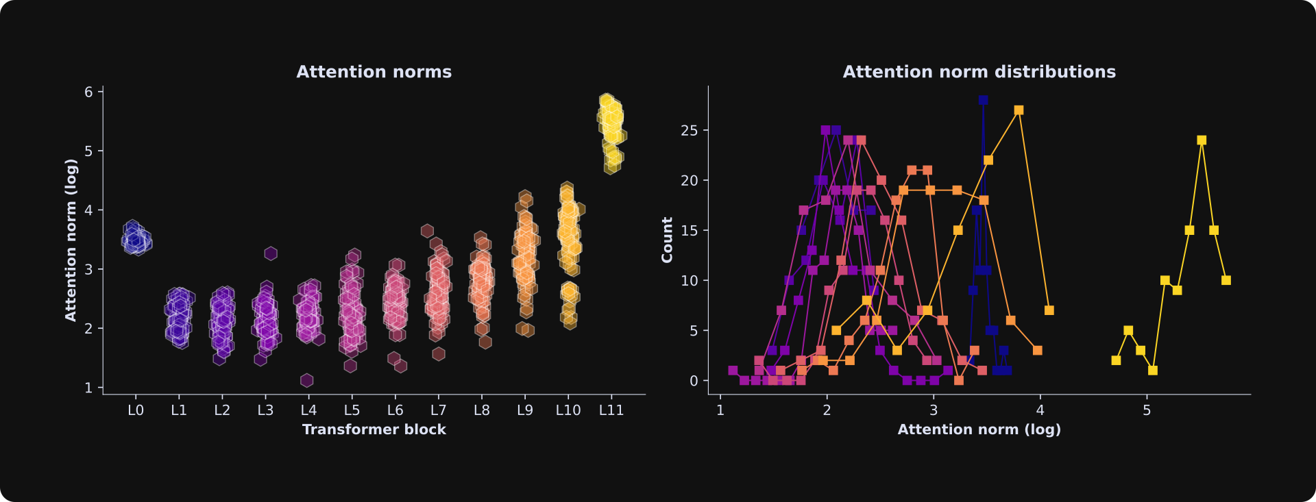 To examine the distribution of attention norms, I extract histograms. There’s only 94 tokens, so rather than specifying the number of bins, I use the Freedman-Diaconis guideline to algorithmically select an appropriate number of histogram bins.