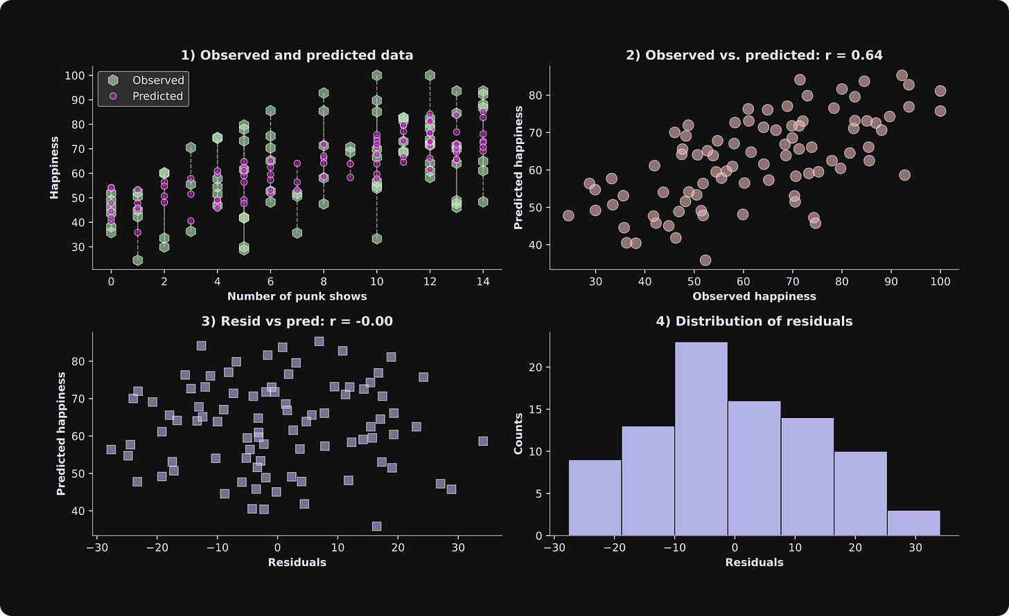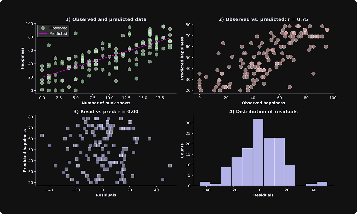 WARNING: The correlation between the observed and predicted data shown in the title is informative but is not a suitable measure of goodness-of-fit. I’ll explain why in the next section.The residuals (model estimation errors) are on the x-axis, and the predicted data (life happiness in our example here) are on the y-axis. The correlation between the predicted data and the residuals is zero. That’s no quirk of our simulated example: The correlation between the predicted data and the residuals is always exactly zero. That’s because the best-fit line minimizes the orthogonal projection of the data onto the model fit (a mathematical result of the linear algebra of least-squares). But the point is that you want to inspect this plot for the shape of the scatter plot. It should look like an amorphous cloud, not a funnel or a teardrop. In other words, the math of least-squares forces no linear relationship between the residuals and the predicted data, but you need to check that there is no nonlinear relationship. A nonlinear relationship is a sign of a poor model fit.