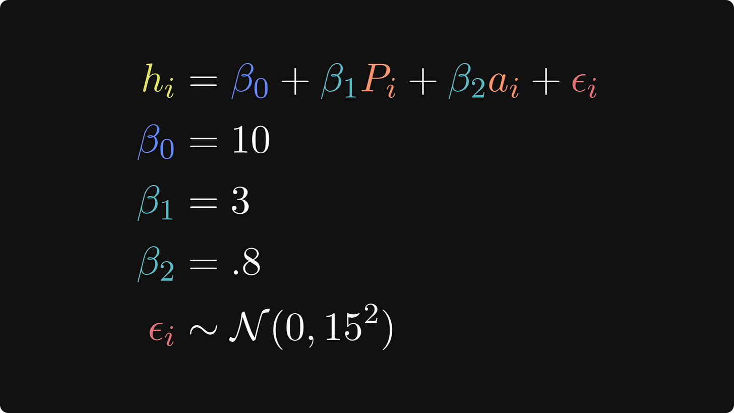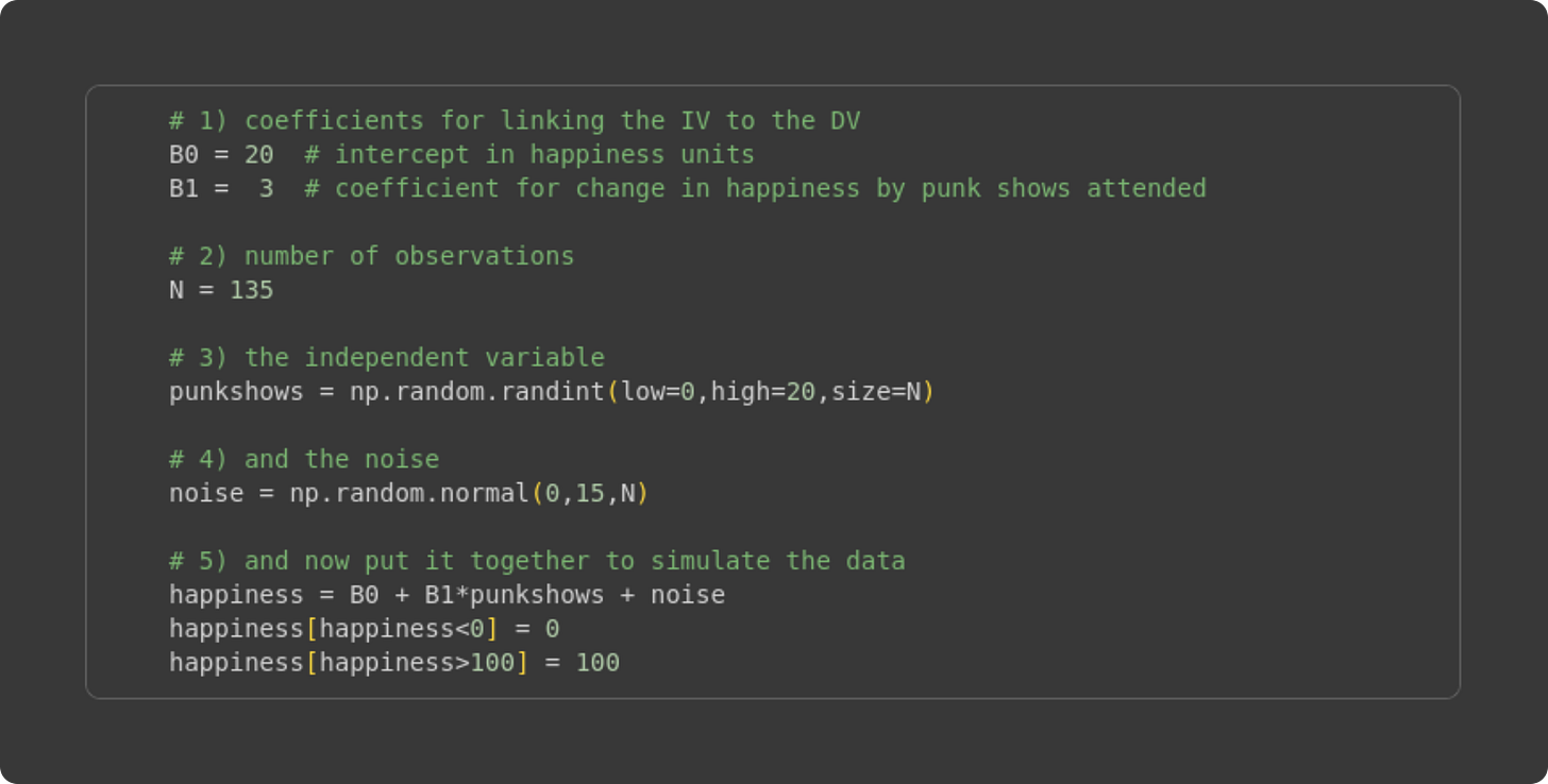 Simulating data to learn about least-squares fitting is straightforward: Start with the model equation, specify values for the 𝛽 coefficients and IVs, choose simulation parameters such as sample size and amount of noise, and then implement that model equation in code.