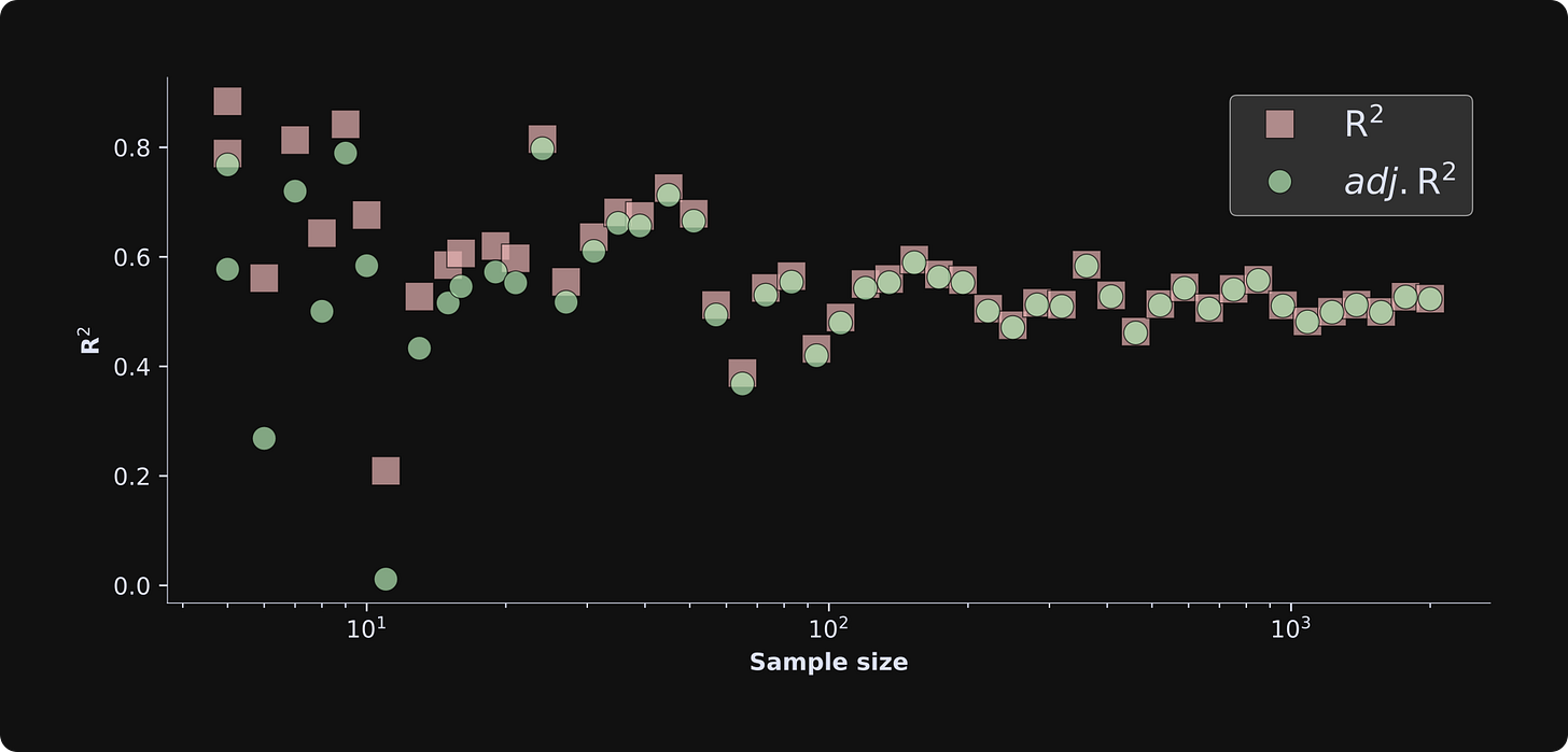 Let’s run an experiment. The goal of the experiment will be to study the importance of sample size on the model fit to the data, using both R2 and adjusted R2. In a for-loop, we will generate new datasets using identical regression parameters and least-squares model-fitting, but different sample sizes and noise generations. After the experiment, we can visualize R2 and adjusted R2 as a function of sample size.