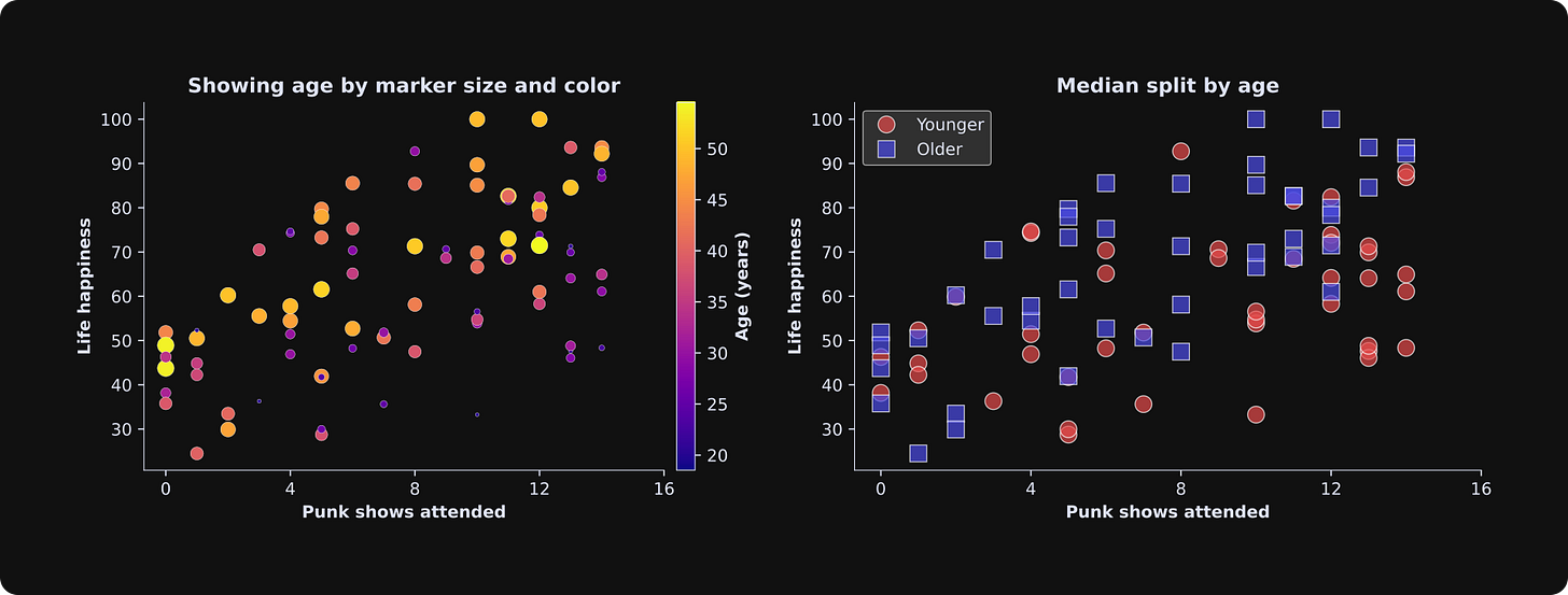 Left panel: Punk show count is on the x-axis and life happiness is on the y-axis. Age is represented both by the size of the marker (larger circles correspond to older people) and also by color (see colorbar). Technically, it is redundant to encode the same variable (age) using two dimensions (size and color), but I think it helps with the visualization. In practice, you might choose only one dimension.