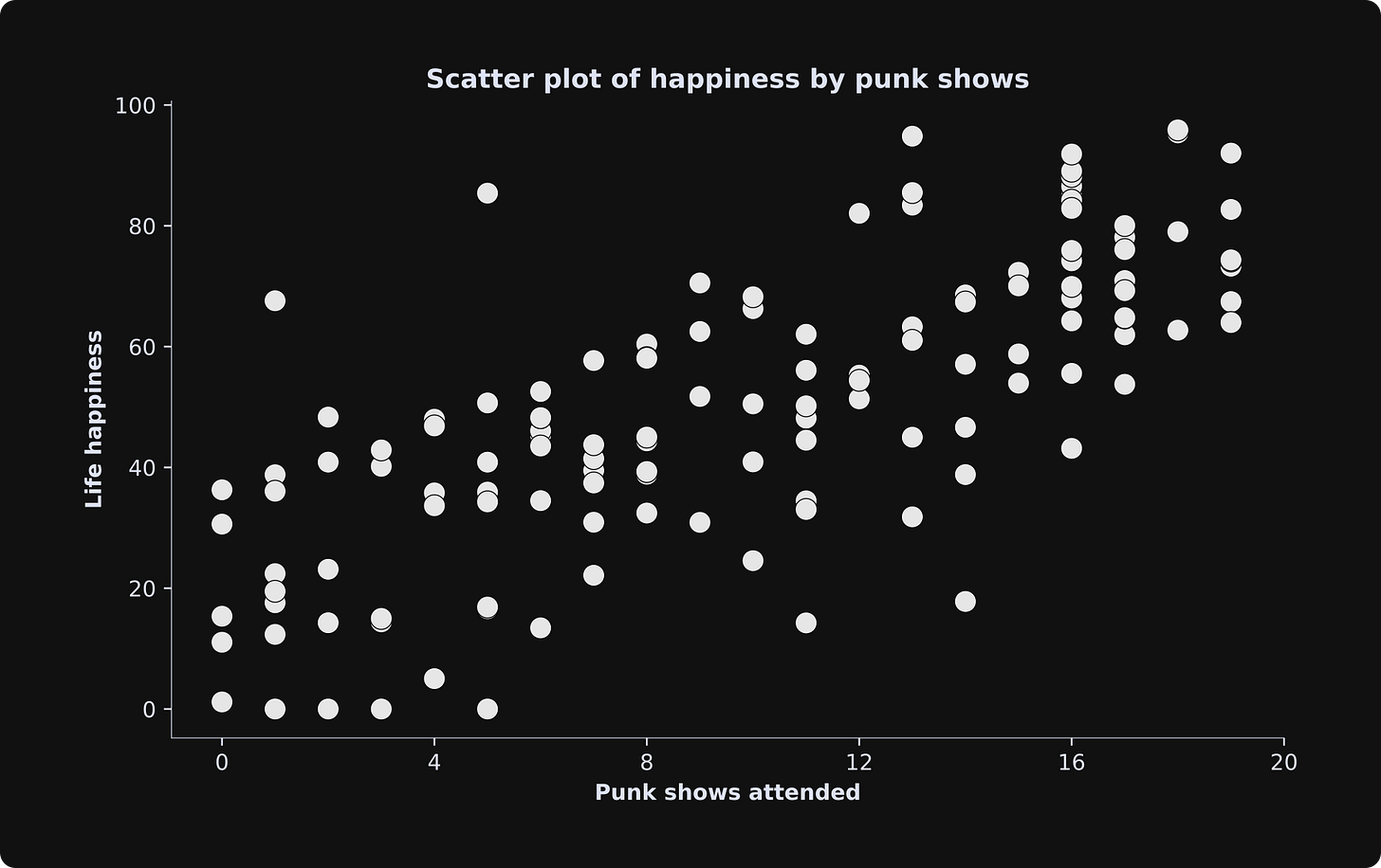 I’ll start with the ground-truth relationship between punk shows and life happiness, which is mathematically expressed like this: