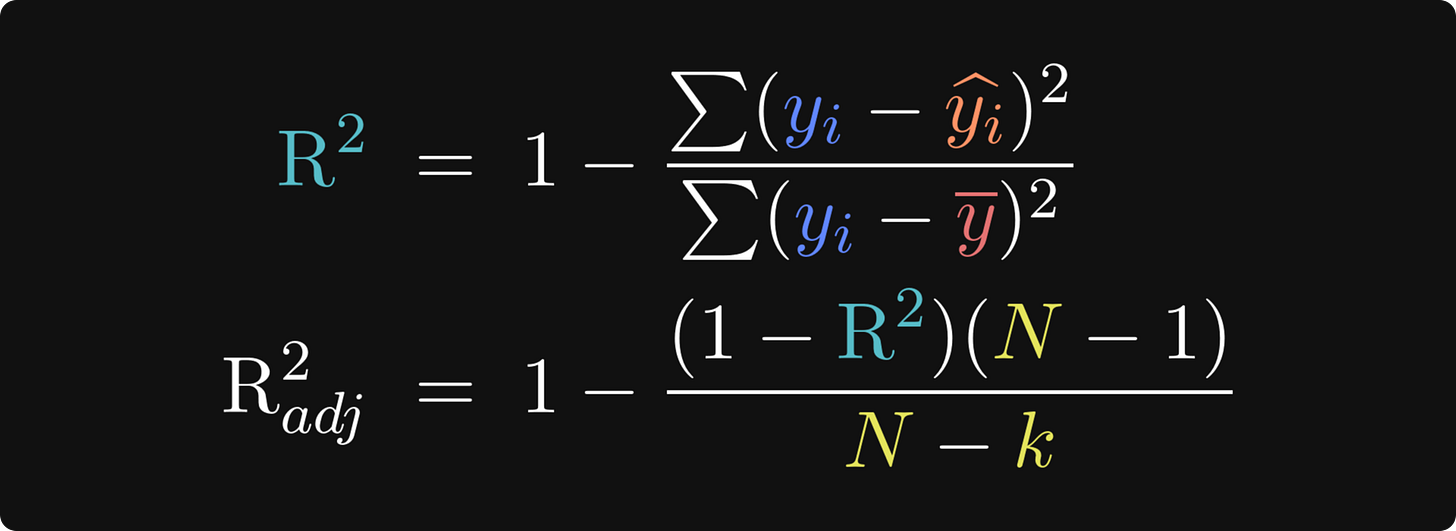 Fortunately, the solution to that problem is simple: Use the adjusted R2! The key update is to scale the R2 by the number of parameters in the model — the number of 𝜷 coefficients (including the intercept term). k is the number of model parameters, and N is the total number of observations. N-k is called the degrees of freedom, and N - 1 in the numerator is the degrees of freedom of the baseline model, where every observation is assumed to equal the mean (same as the denominator in R2).