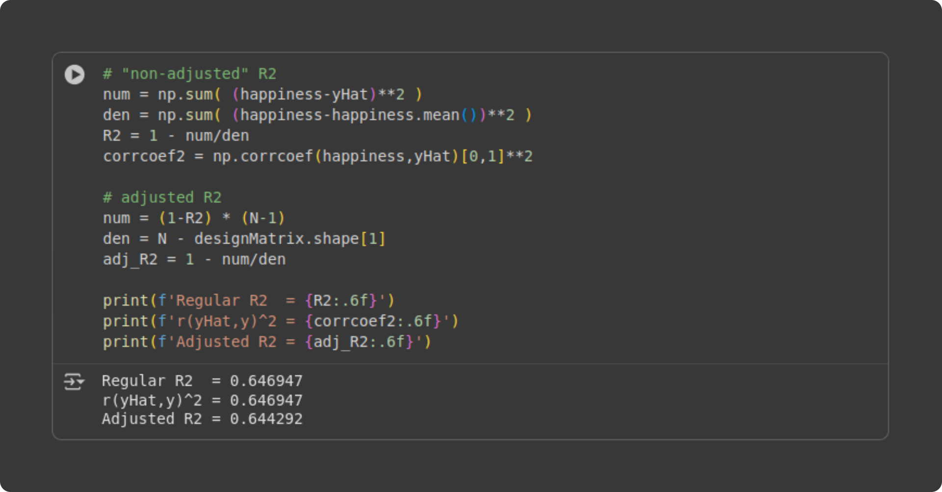 Conceptually, the idea of R2 (pronounced “are-squared” and also written as R2 or R^2) is to compare the residuals from the fitted model against the residuals from a “baseline model” in which each data point is modeled as the average value. That’s the first equation below. Let’s think about it for a minute: If the model predictions (the yi with the caret on top in the numerator) are very close to the actual data observations (yi), then the numerator of that fraction will be close to zero, which means the fraction will be close to zero, which means R2 will be close to 1. On the other hand, if the model is a poor fit to the data, the numerator will be larger and R2 will be closer to zero. By the way, the formula for R2 is equivalent to a correlation coefficient between the predicted and actual data. I’ll demonstrate that in the code.