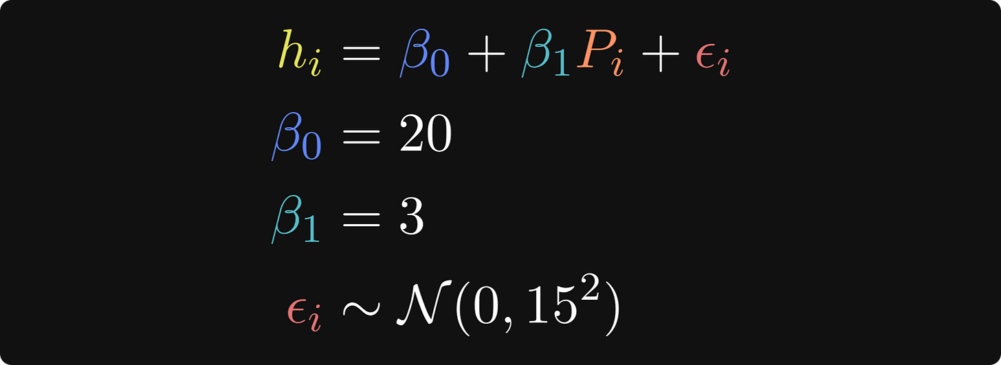 In these equations, hi is the life happiness of person i, 𝛽0 is the intercept, which is the level of life happiness for someone who has been to zero punk shows, 𝛽1 is the regression coefficient that describes the change in happiness for each addition punk show attended, Pi is the number of punk shows that person i has been to, and 𝜖 is a residual — it’s the individual variability in happiness ratings that the model does not explain (even Tivadar would agree that there is more to being happy than just listening to Hungarian punk!).