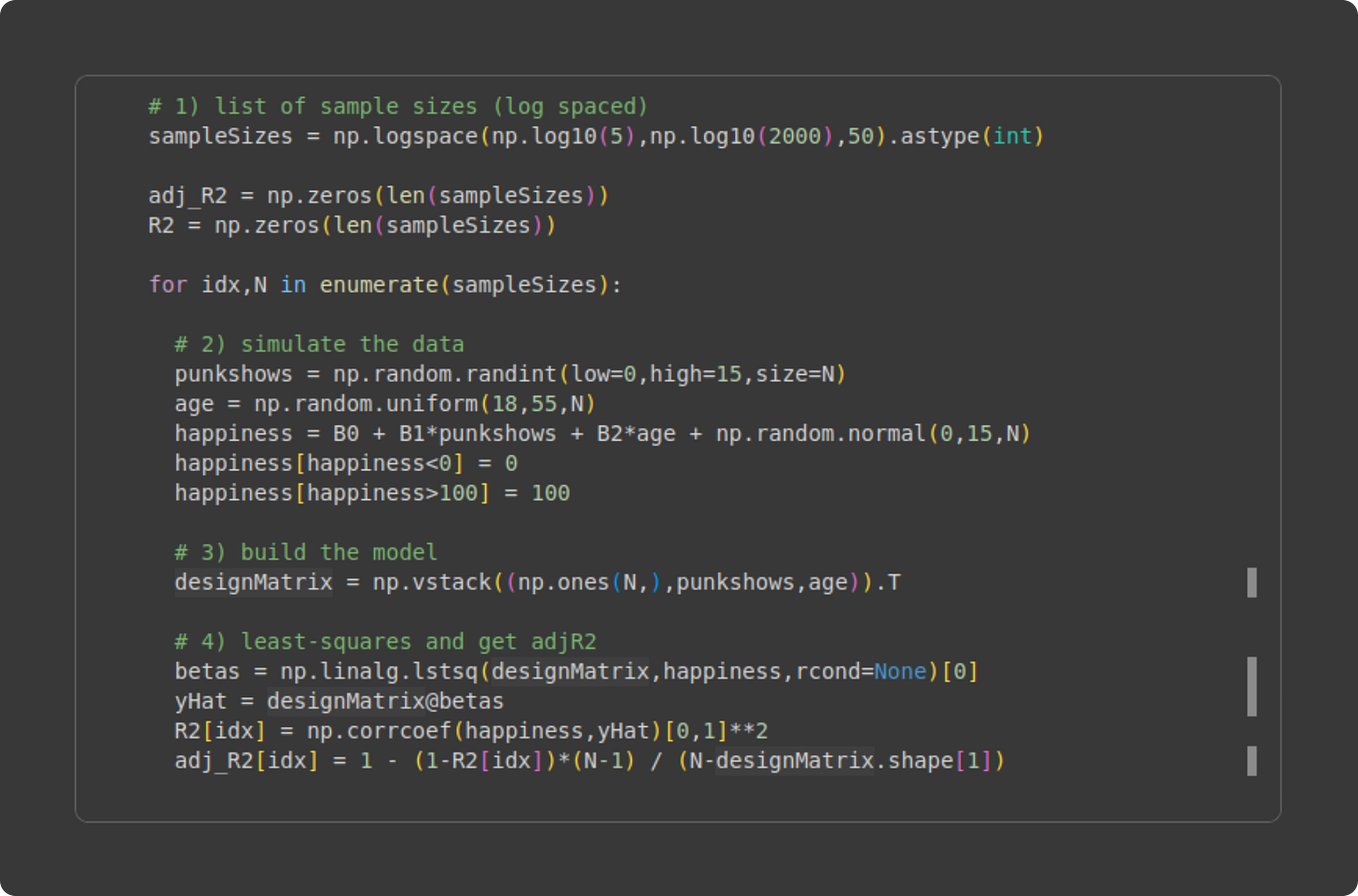 Inside the for-loop, I generate new data. I hope all this code looks familiar! It’s the same code you’ve seen before; the only difference is that the sample size (variable N) is defined in the for-loop definition from variable