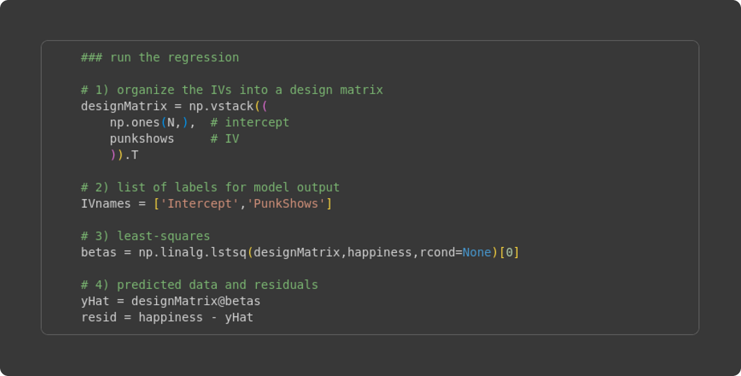 Here’s the least-squares implementation. In the previous Post, I directly translated the math into Python code (e.g., using np.linalg.inv). That approach is great for seeing the link between math and code, but the matrix inverse is prone to numerical inaccuracies and precision errors. The numpy function lstsq arrives at the same result, but using more numerically stable algorithms such as QR decomposition and Gaussian elimination.