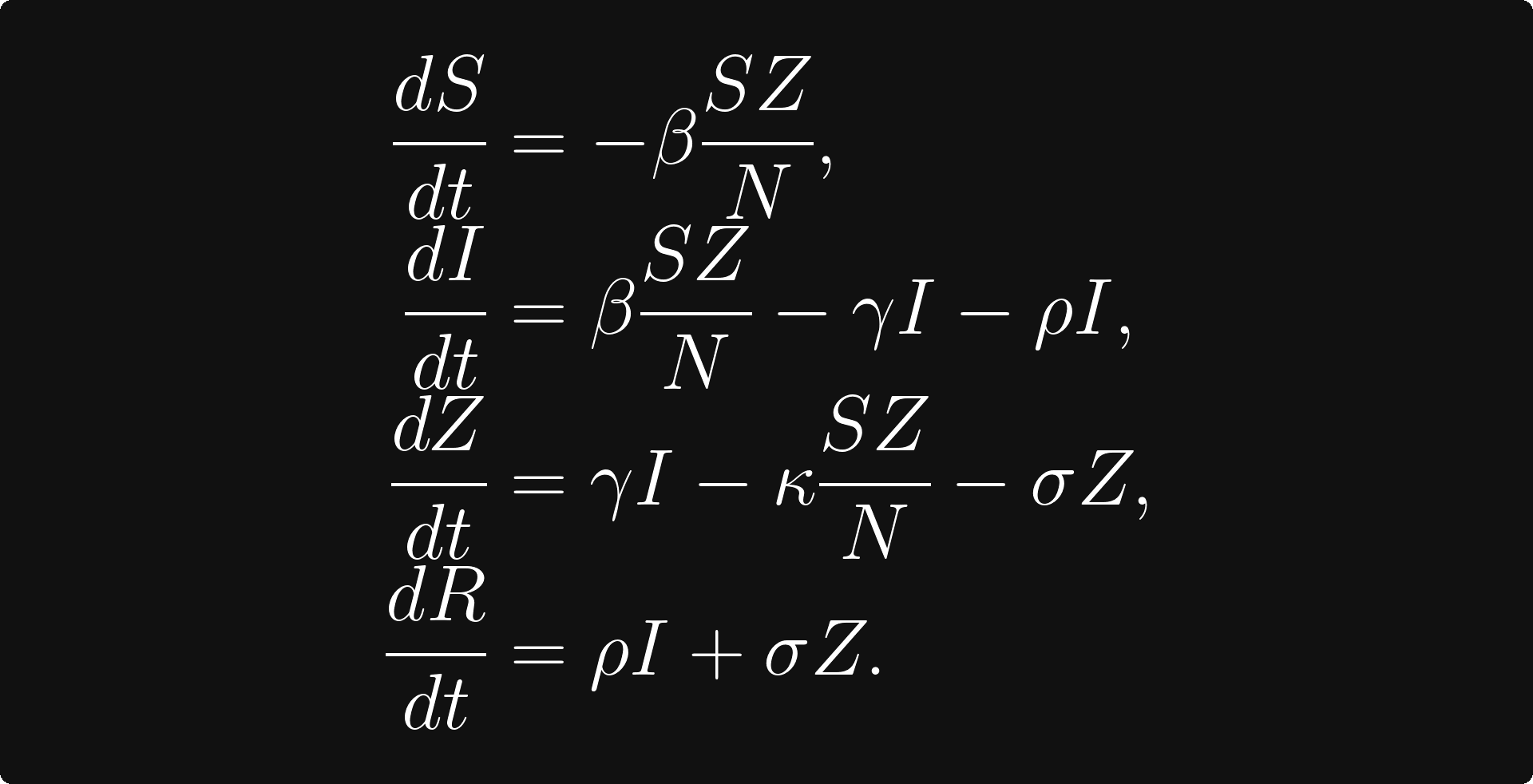with N = S + I + Z + R. Early on S ~ N (nearly the whole population consists of susceptible individuals), so the basic reproduction number is