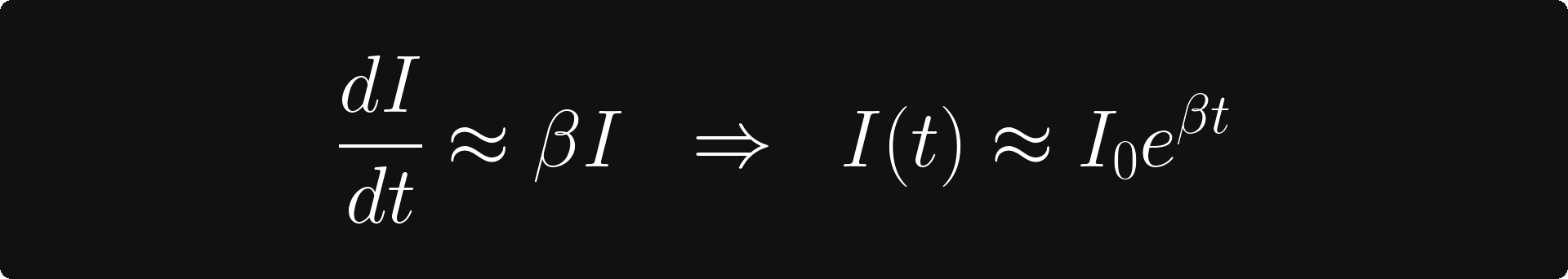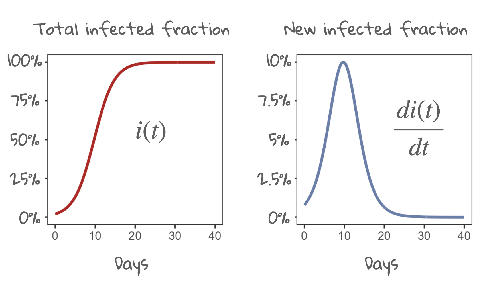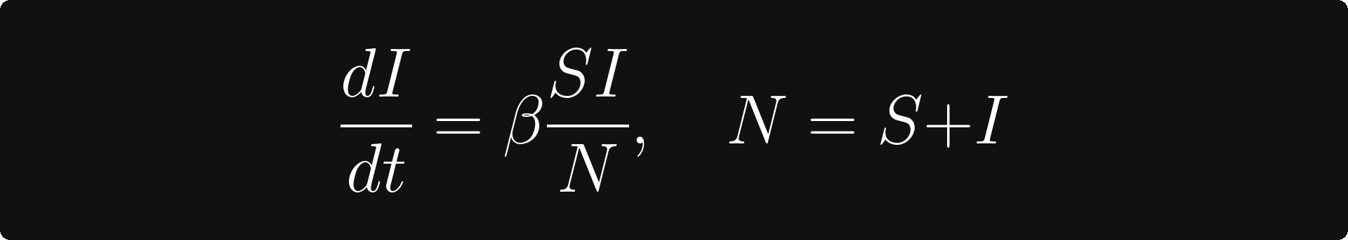 where S denote uninfected computers, I the infected machines and β is the rate of successful transmission. Furthermore, let’s also forget about the specific interaction patterns of the machines: instead of caring about which computer is exactly connected to which other computer, let’s work under the “well-mixed” assumption that any infected can contact any susceptible. We are now ready to transform the above story into an equation, relating the rate at which the number of infected individuals increase with the other variables: