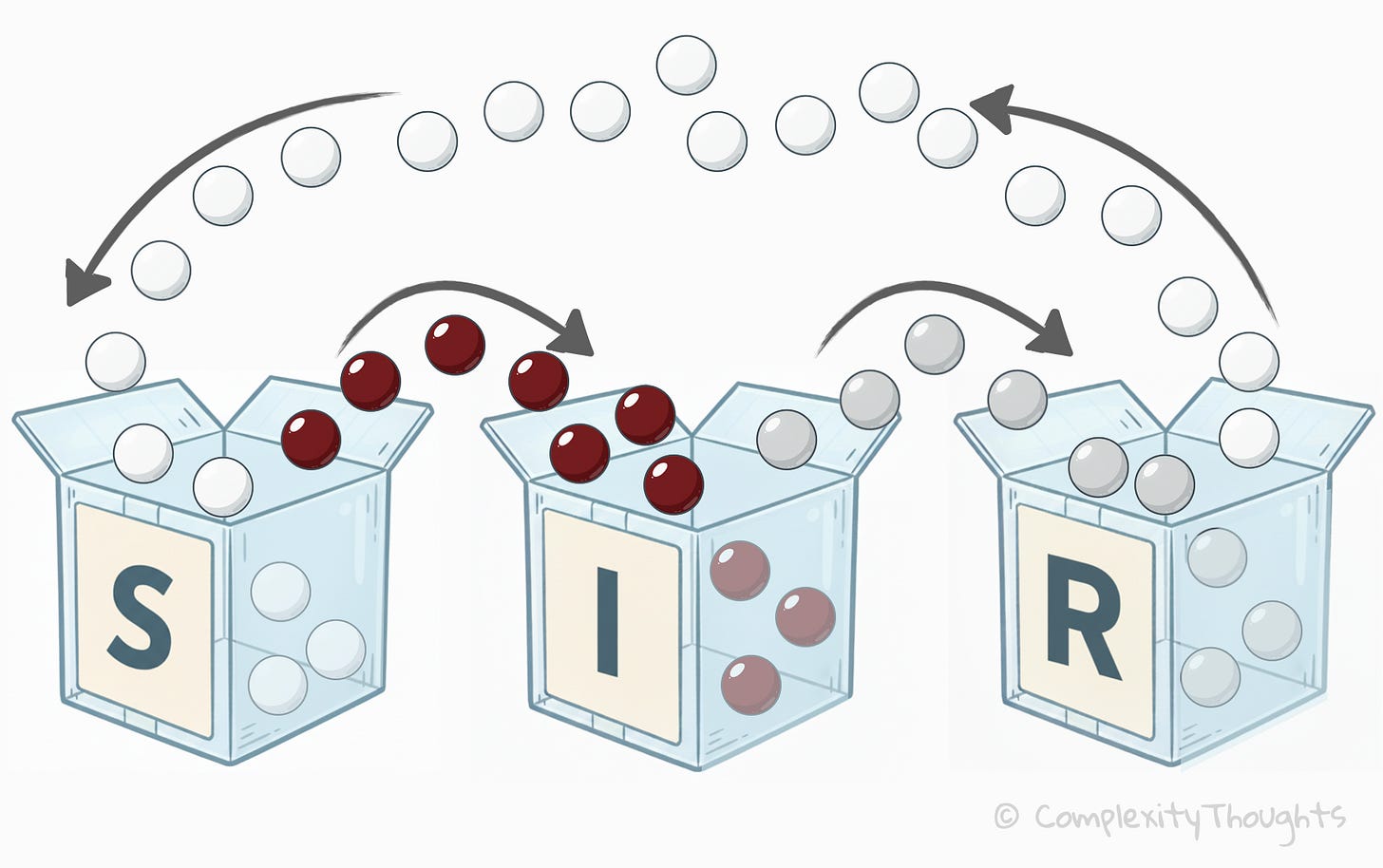 where each arrow represents a rate indicating how often a change of state happens. Once the compartments and flows are clearly defined, the equations almost write themselves. The rest is interpretation.