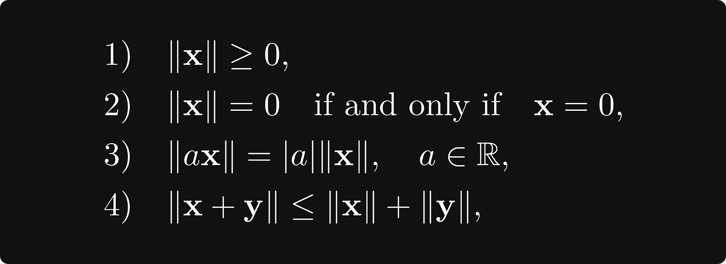This is a special case of a norm. In general, a vector space V is normed if there is a function ‖ ⋅ ‖: V → [0, ∞) such that