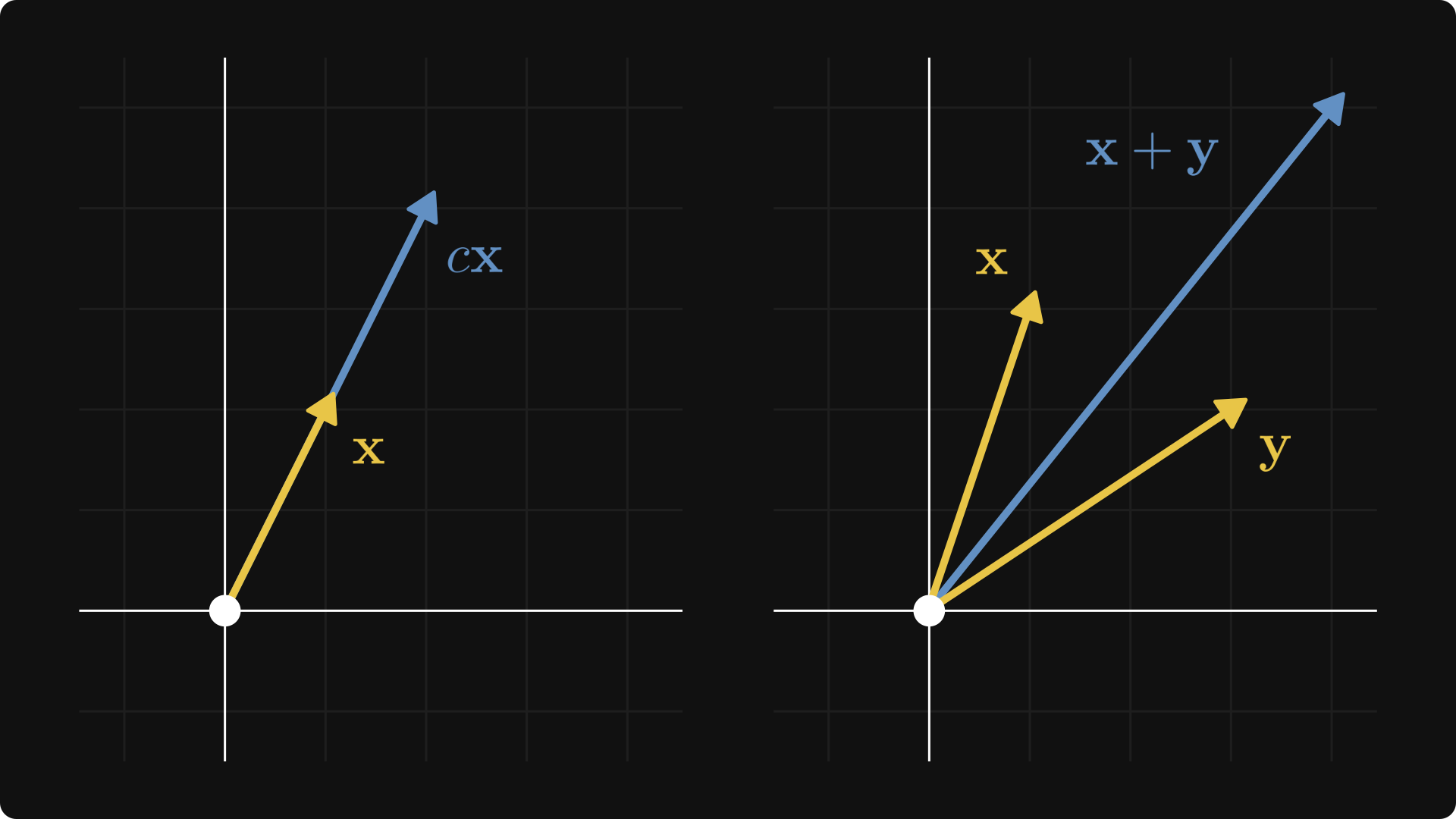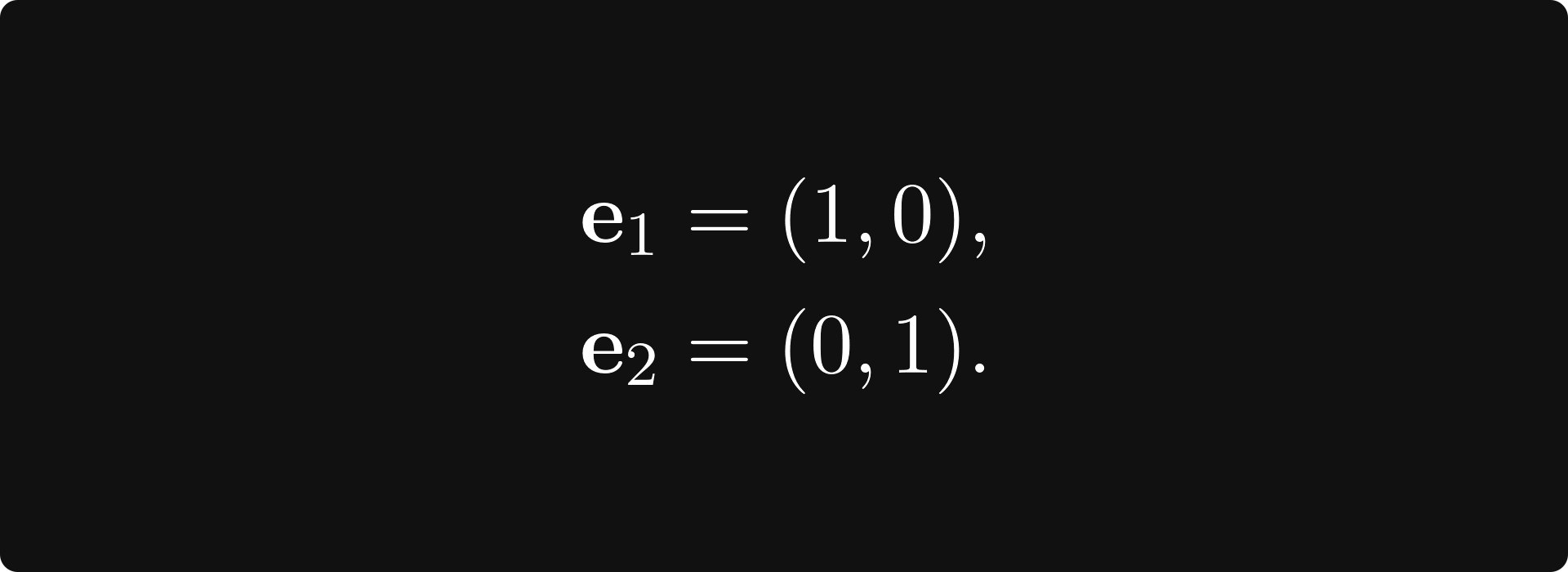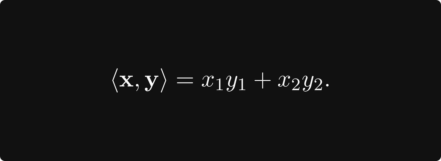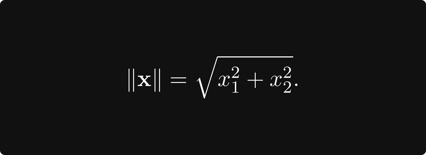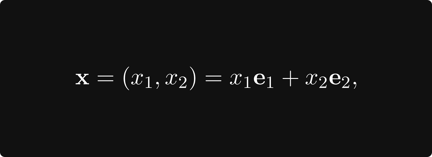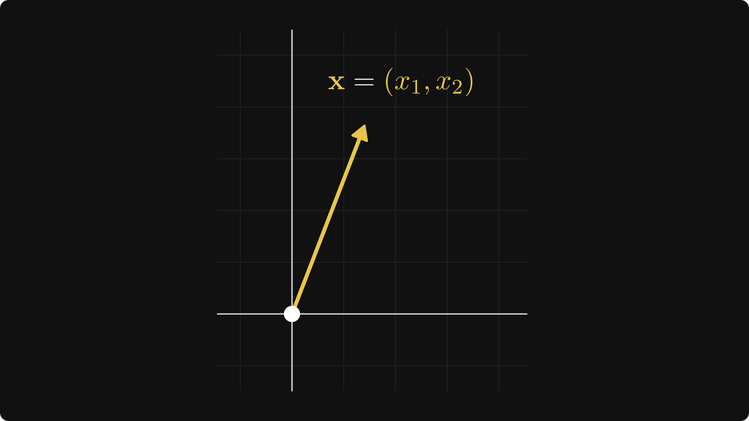 The textbook definition is intimidating and abstract, so let’s talk about a special case first. You can think of each point in the plane as a tuple x = (x₁, x₂), represented by an arrow pointing from the origin to (x₁, x₂).