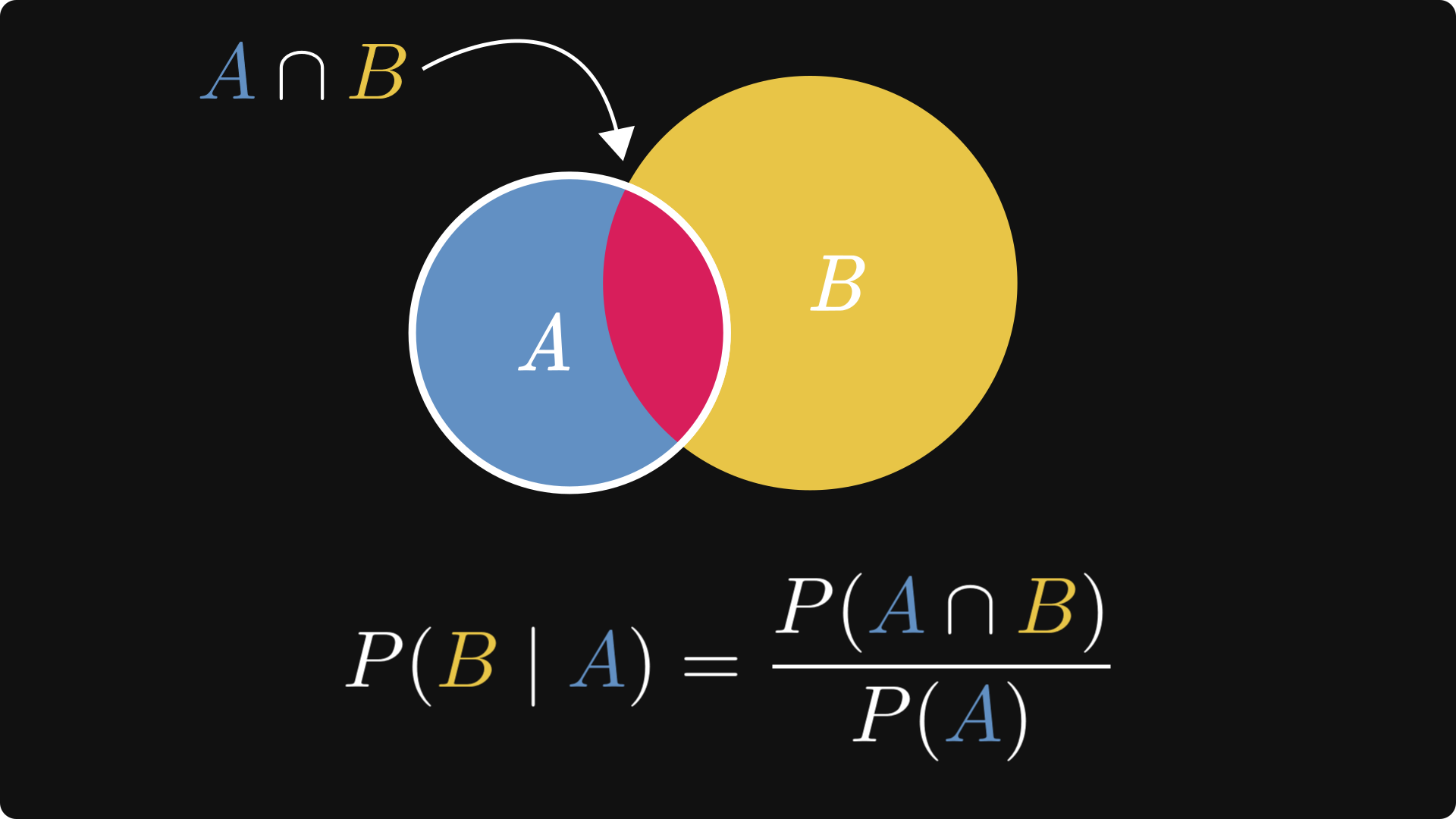 One of the most important concepts in probability theory is conditional probability, which studies probabilities in the context of observations. By definition, it is given by the ratio of the probability of both events occurring and the probability of the observed event.