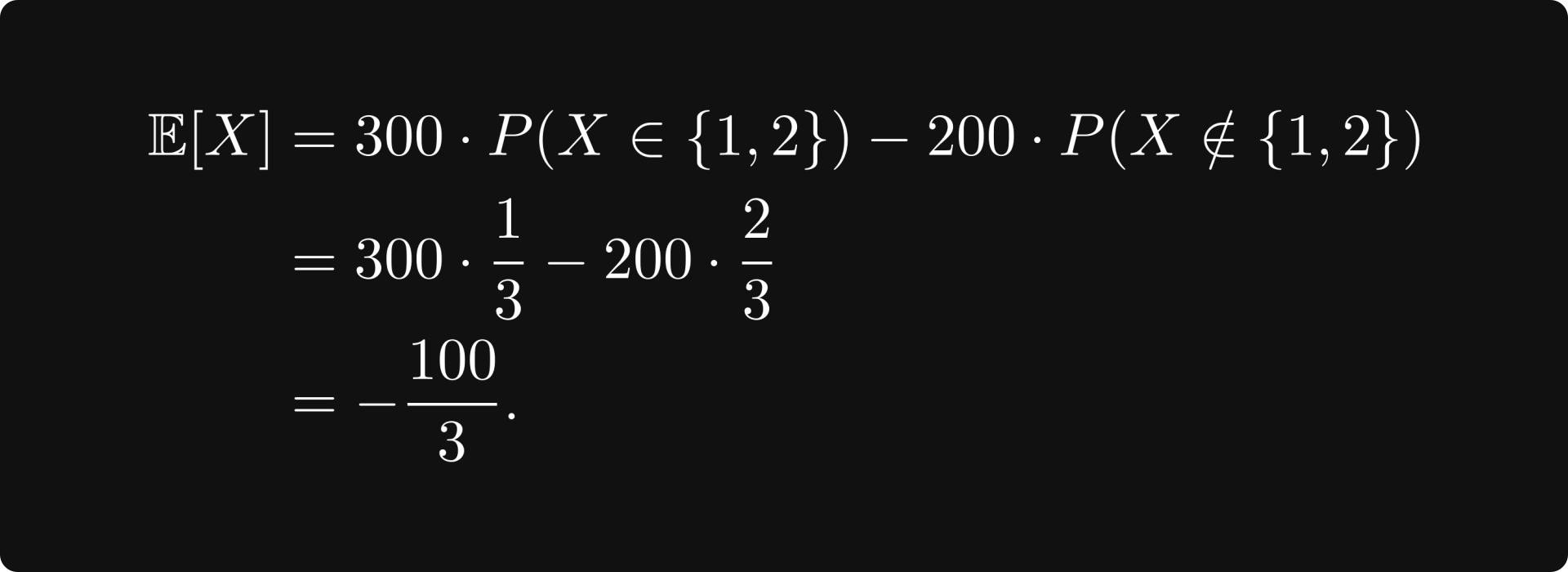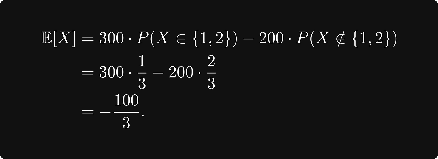 Well, you win 100 bucks with probability 1/3, and you lose 200 with probability 2/3. That is, if X is the random variable encoding the result of the dice throw, then