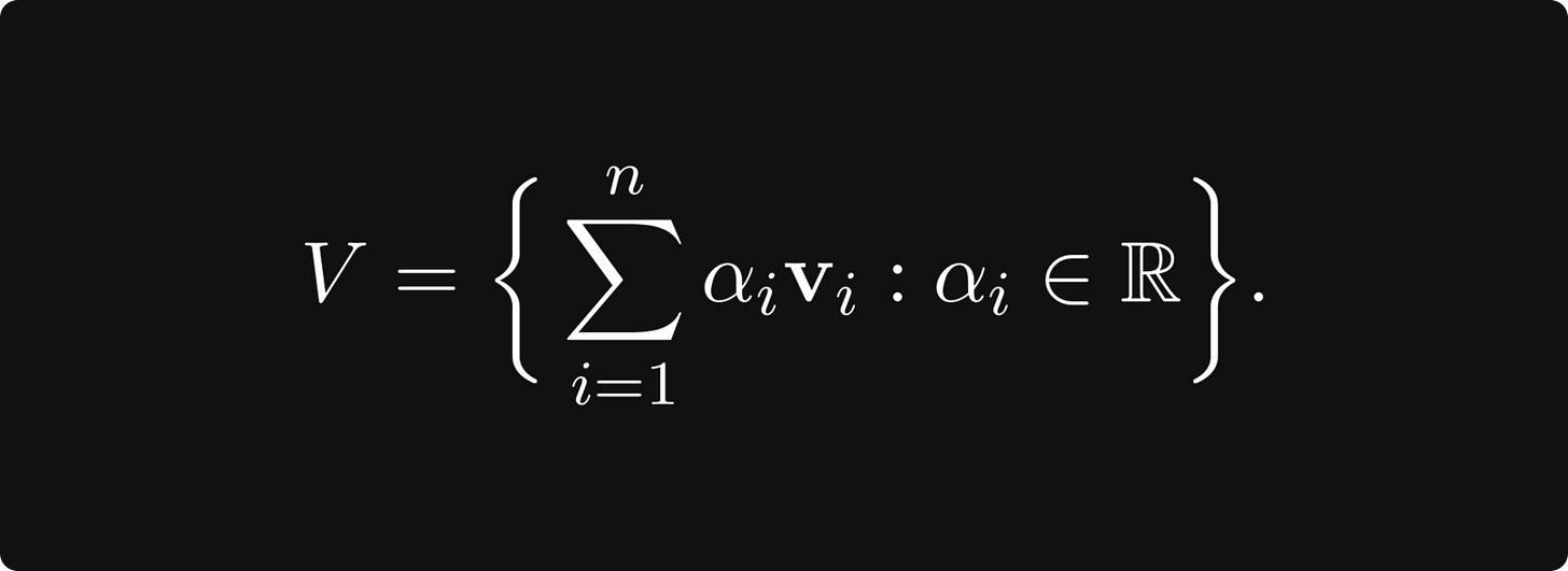 In general, a basis is a minimal set of vectors v₁, v₂, ..., vₙ ∈ V such that their linear combinations span the vector space:
