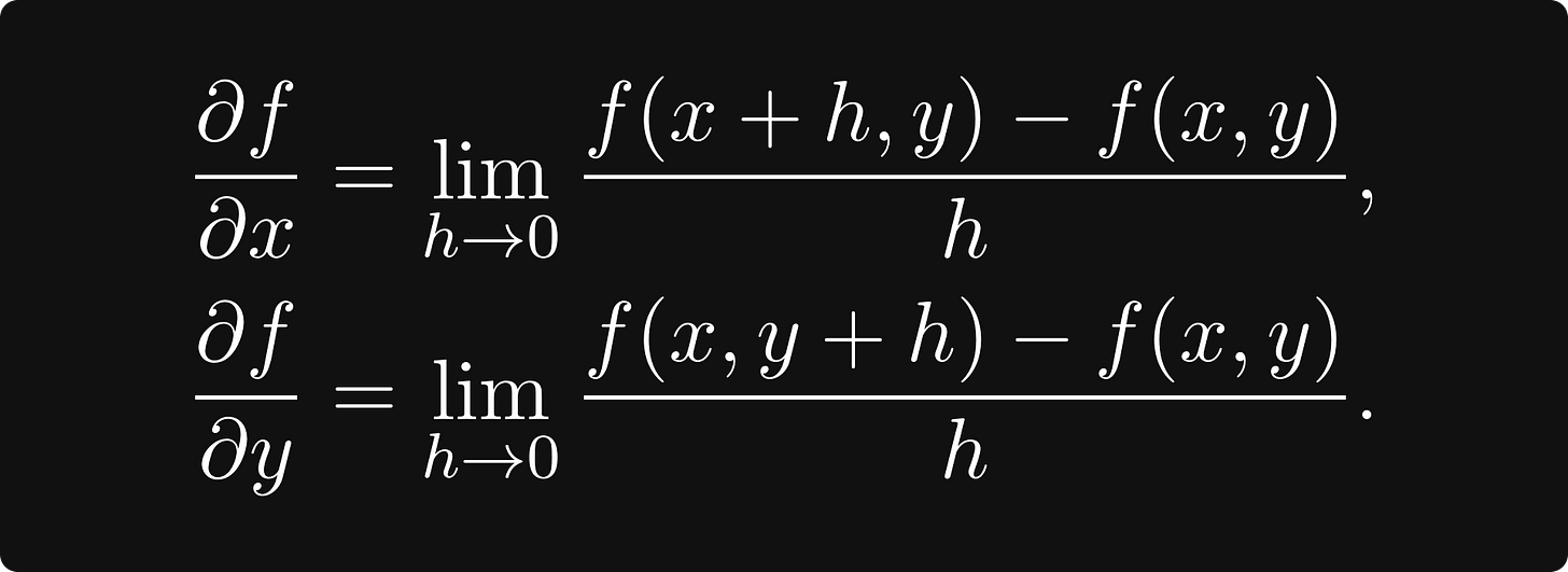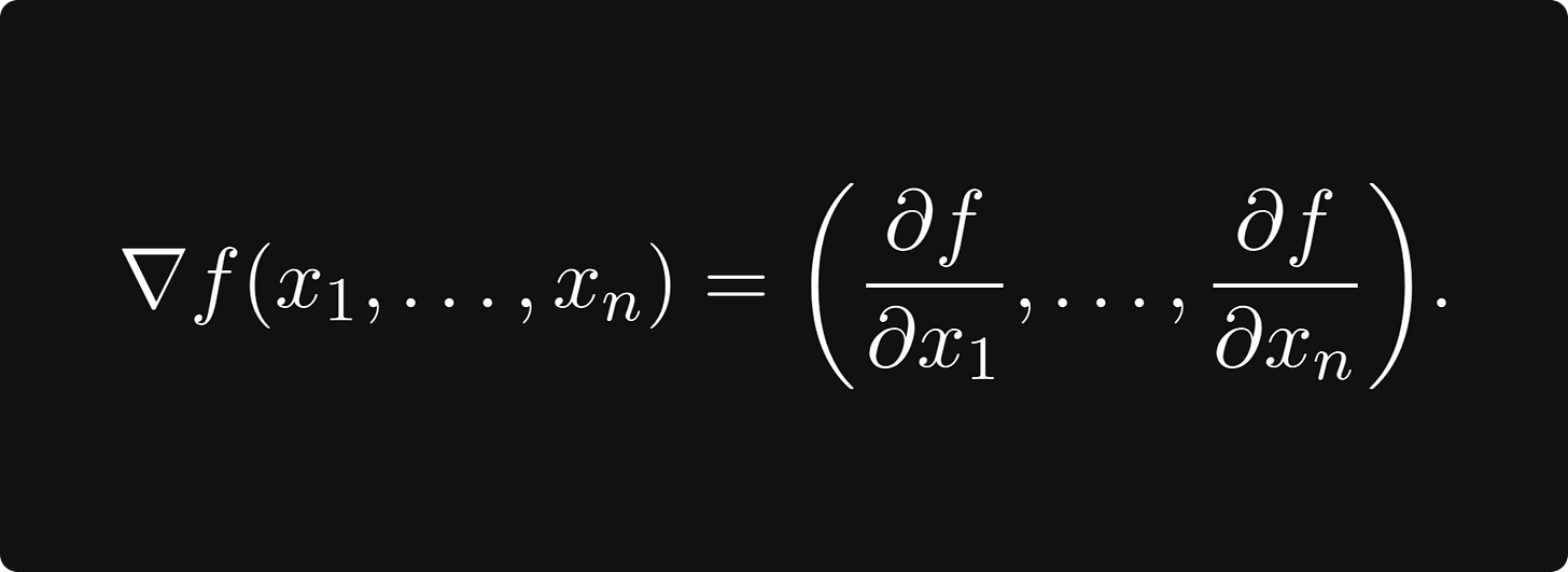Similar to univariate calculus, the two main topics here are differentiation and integration. Let’s suppose that we have a function f: ℝⁿ → ℝ, mapping vectors to real numbers.