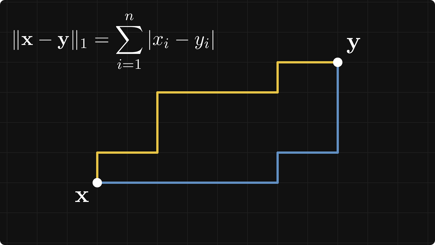 The 1-norm is called the Manhattan norm (or taxicab norm), because the distance between two points depends on how many “grid jumps” you have to perform to get from x to y.