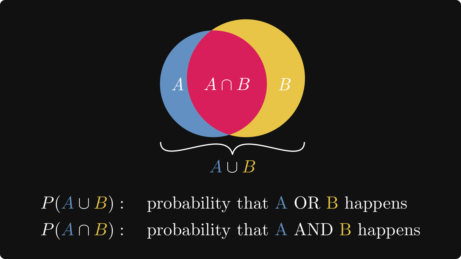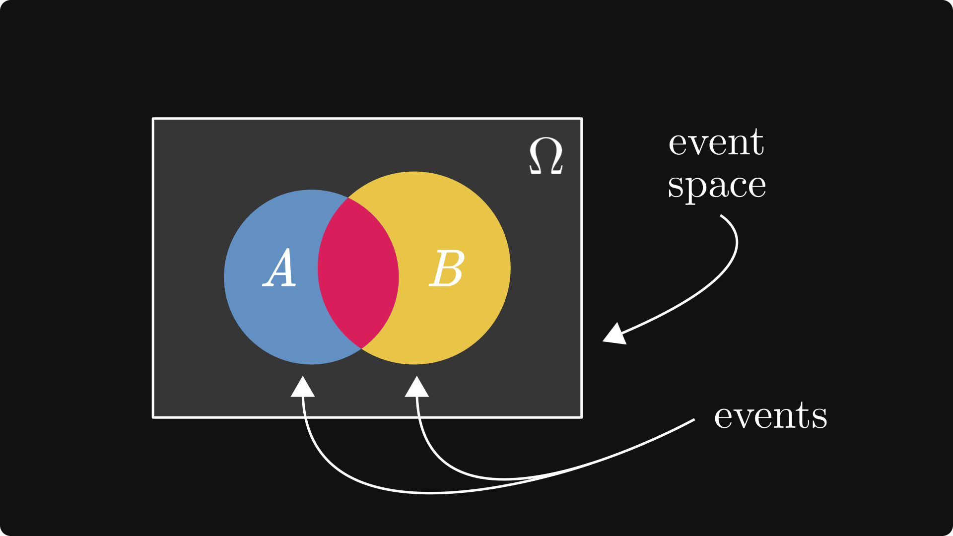First of all, probability is a function that renders a numeric value between 0 and 1 to events. Events are represented by sets, which are subsets in the event space, denoted by Ω.