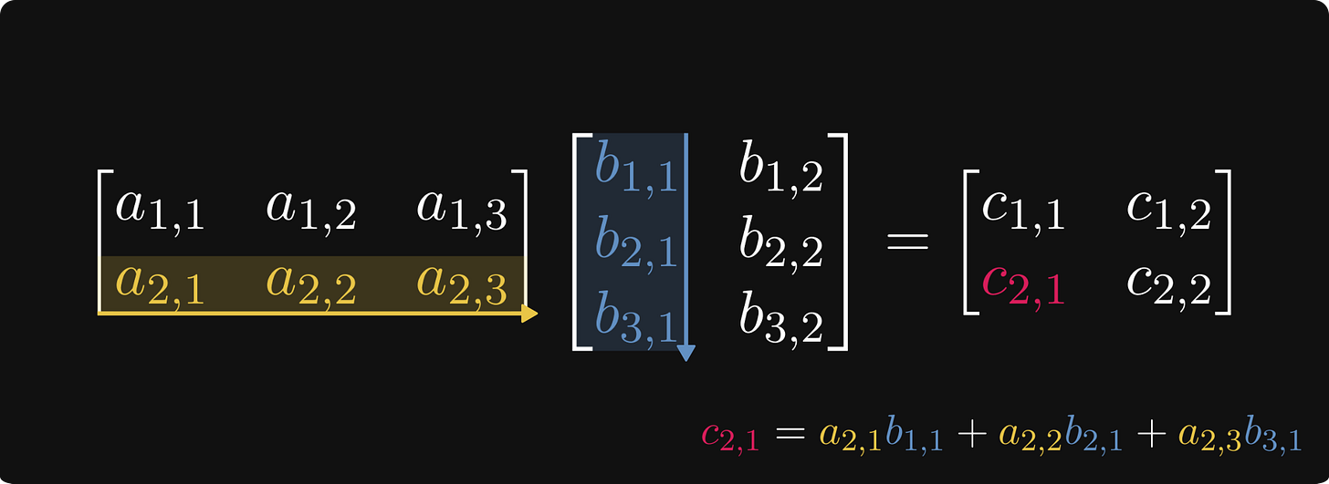 This might seem difficult to comprehend, but it is pretty straightforward. Take a look at the figure below, demonstrating how to calculate the element in the 2nd row, 1st column of the product.