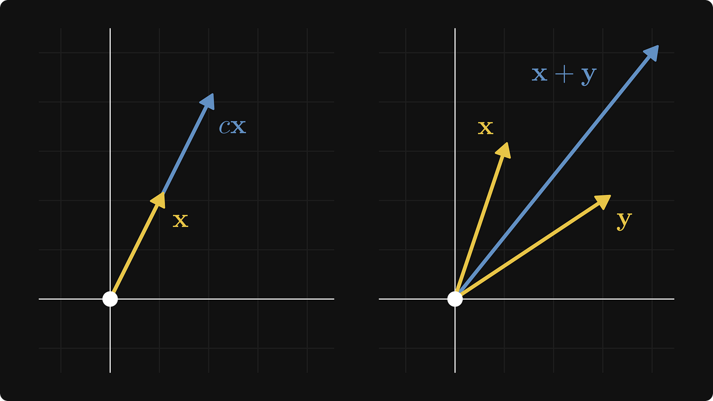 You can add these vectors together and multiply them with scalars. Algebraically, it simply goes as