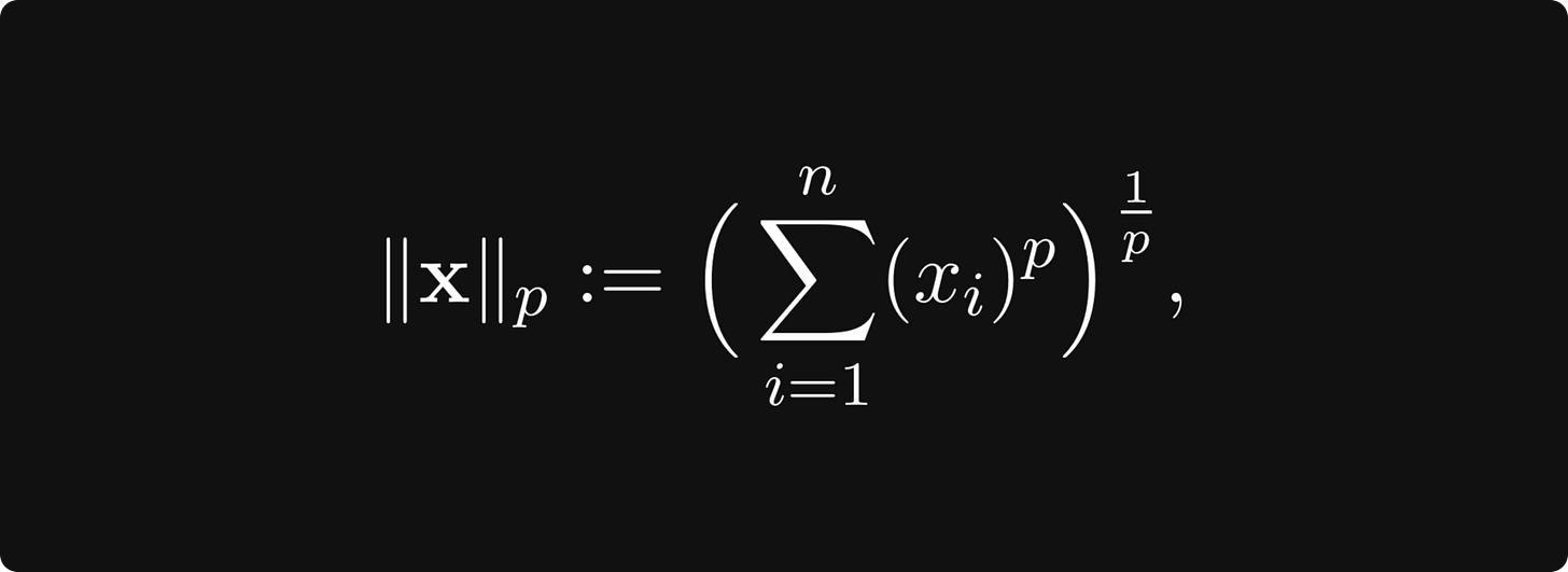 Again, this might be scary, but this is a simple and essential concept. There are a bunch of norms out there, and the most important is the p-norm family, defined for any p ∈ [0, ∞) by